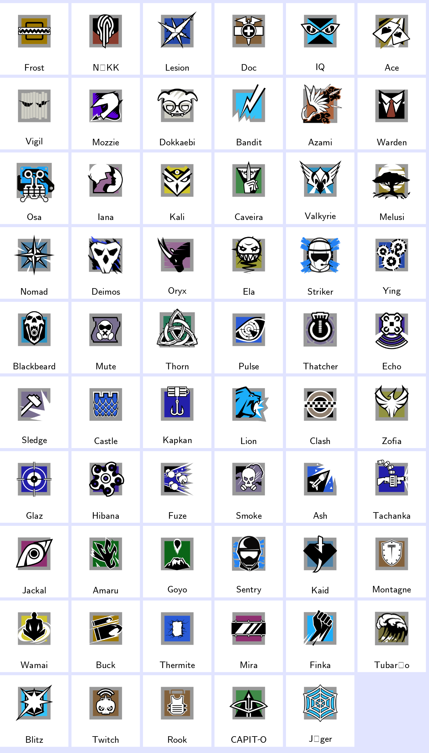 Some Operators: Frost, Nokk, Lesion, Doc, Iq, Ace, Vigil, Mozzie, Dokkaebi, Bandit…