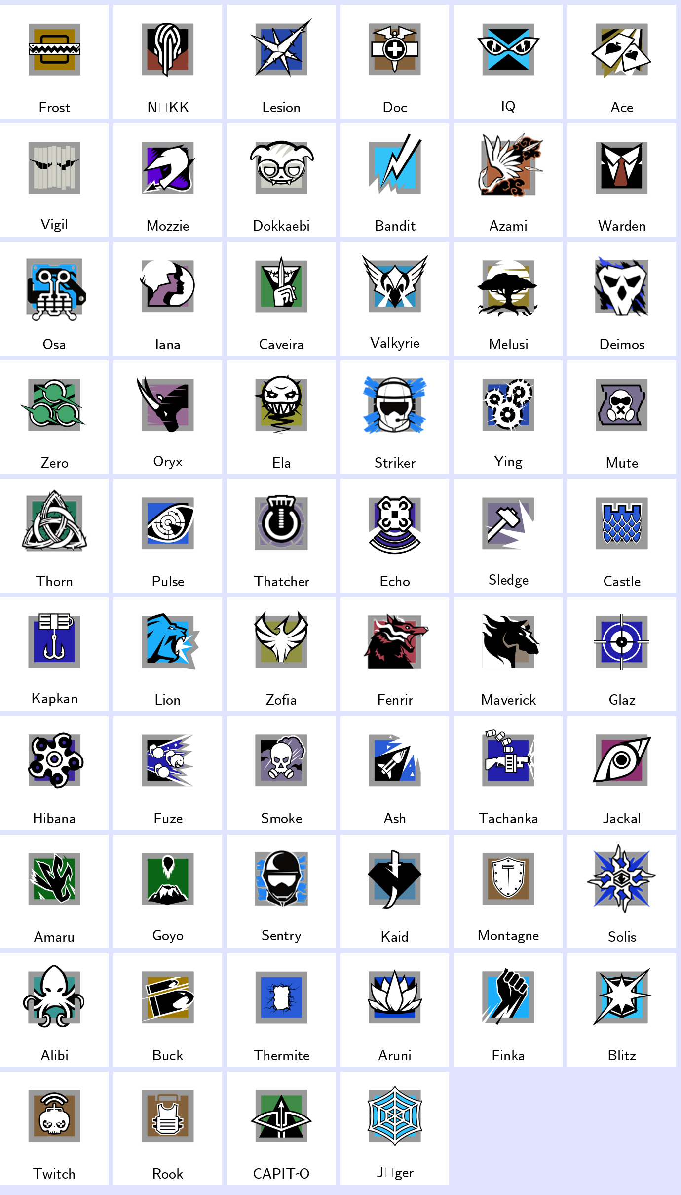 Some Operators: Frost, Nokk, Lesion, Doc, Iq, Ace, Vigil, Mozzie, Dokkaebi, Bandit…