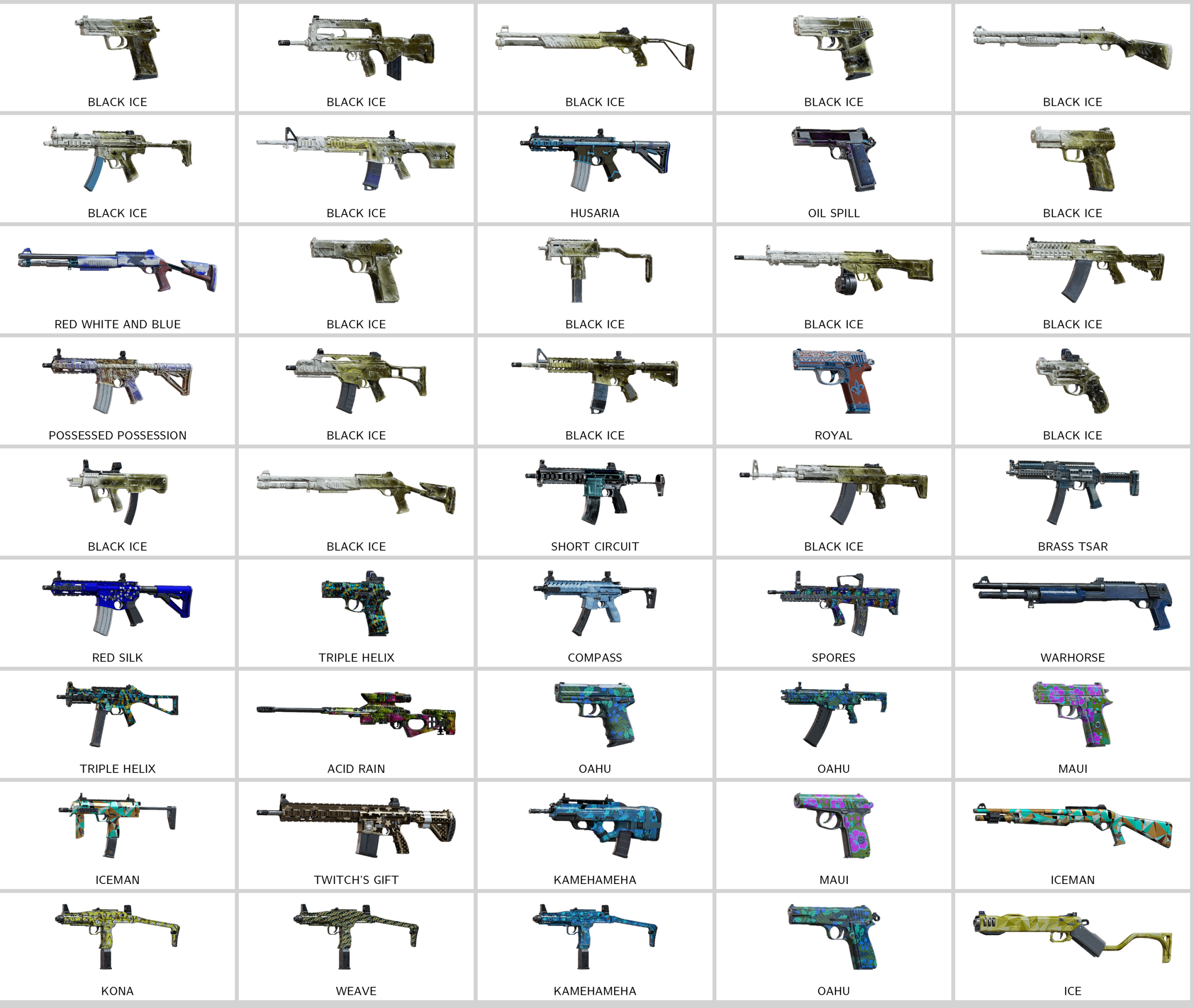 Some of Other Skins: Fatal Koi (Supernova), New Notches (P226), Target (R4C), Glory (5.7 USG), Luxury (F2), Surfacing Darkness (9mm C1), Short Circuit (416-C), Bio Shelter (Spear)…