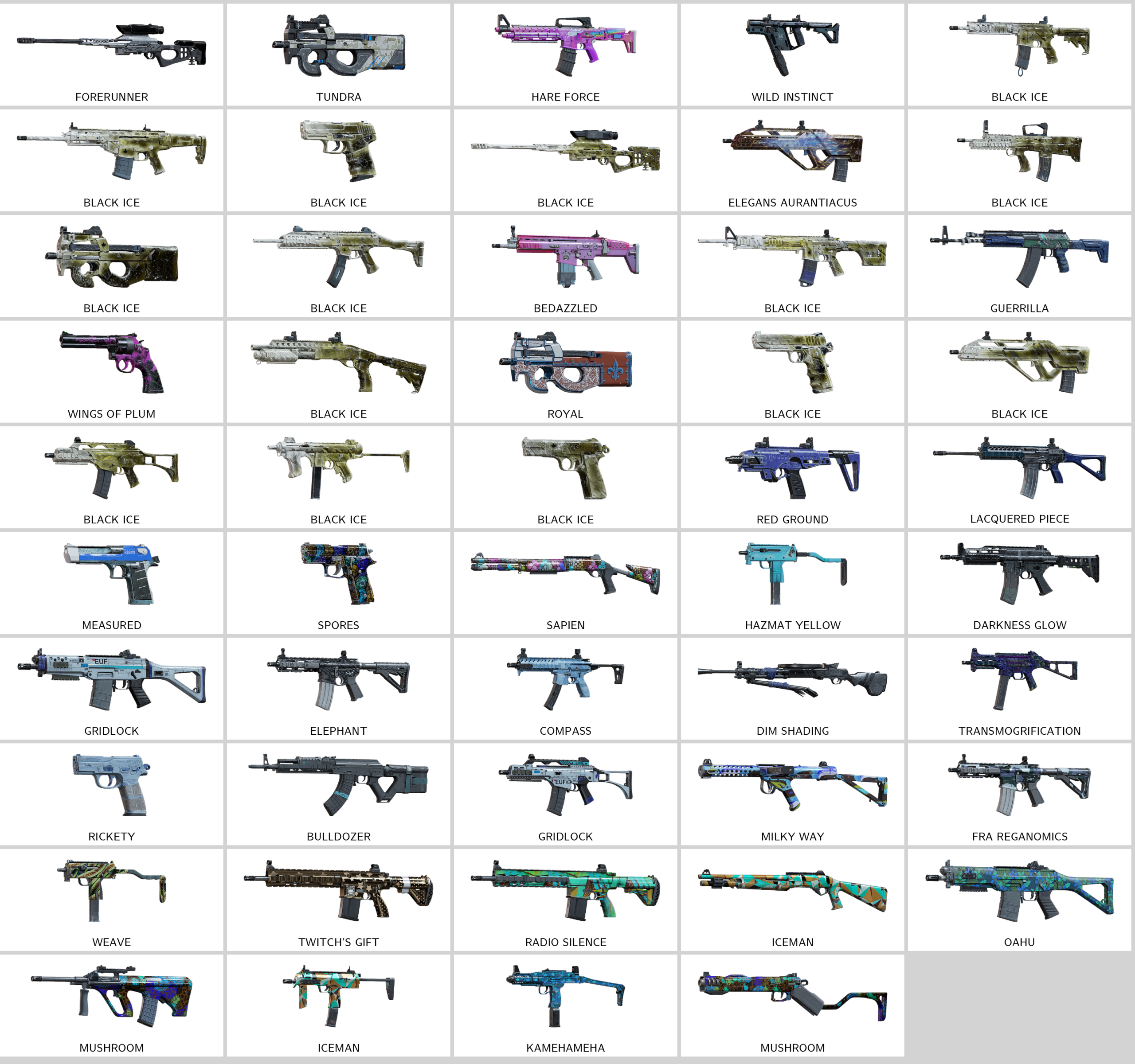 – Tundra (P90), Mad Dog of Shimano (Bearing-9), Military Tarp (AUG A3), Forerunner (CSRX300), Enforcer (M12)