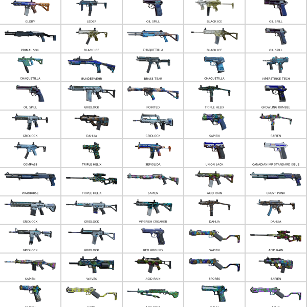Some of Other Skins: Black Ops (AK12), Short Circuit (416-C), Oil Spill (P229), Compass (MPX), Pointed (9mm C1), Chameleon (Mk1 9mm), Brasil (M249), Dahlia (PMM)…