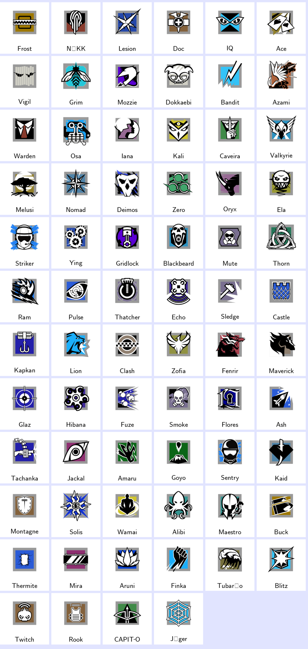 Some Operators: Frost, Nokk, Lesion, Doc, Iq, Ace, Vigil, Grim, Mozzie, Dokkaebi…