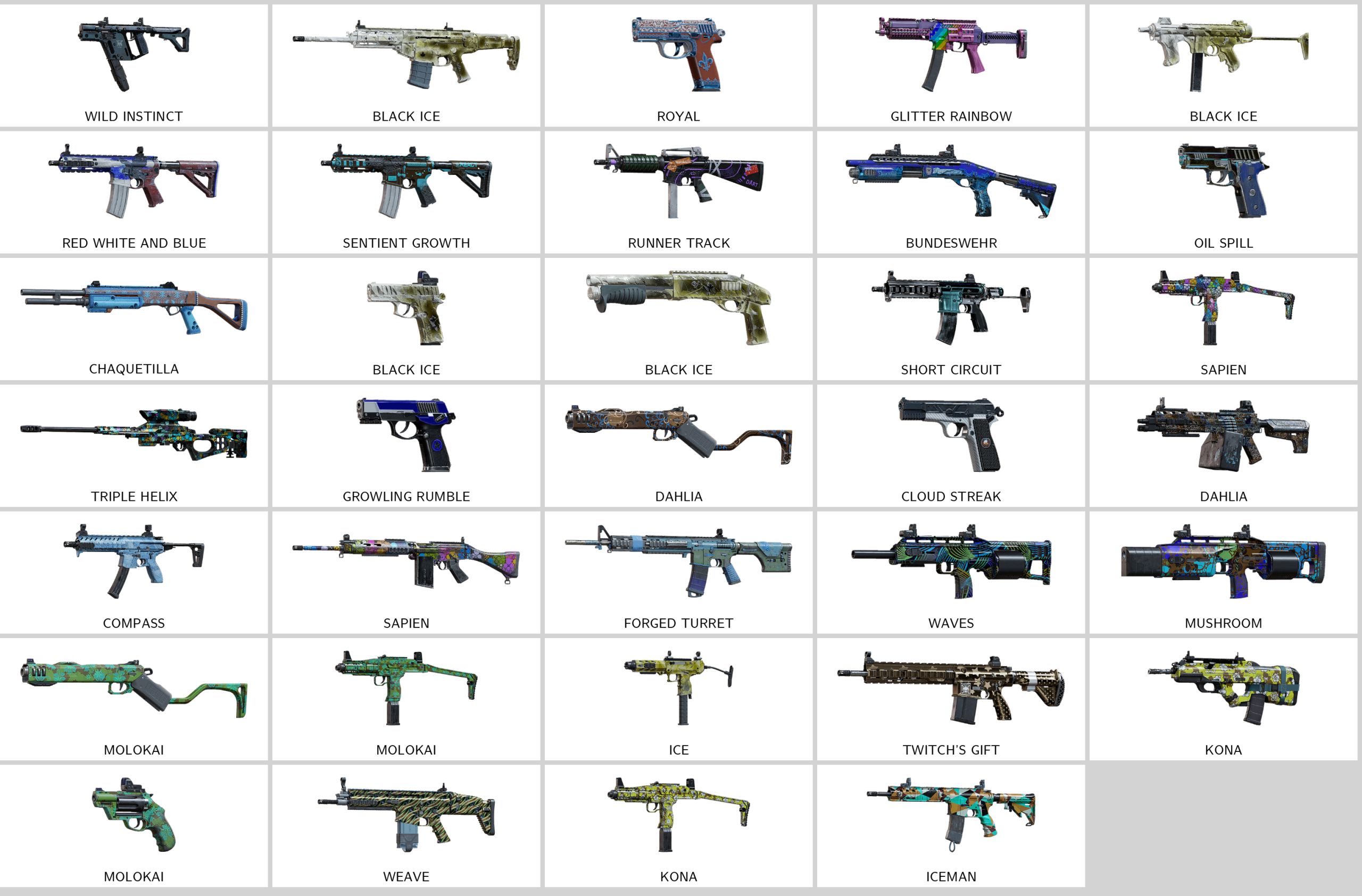 – Ethereal Marksman (416-C), Arctic Range (C8-SFW), Urban Graffiti (Type-89), Scavenged Wonder (PARA-308), Scavenged Wonder (CAMRS), Corinthian Coral (TCSG12)…