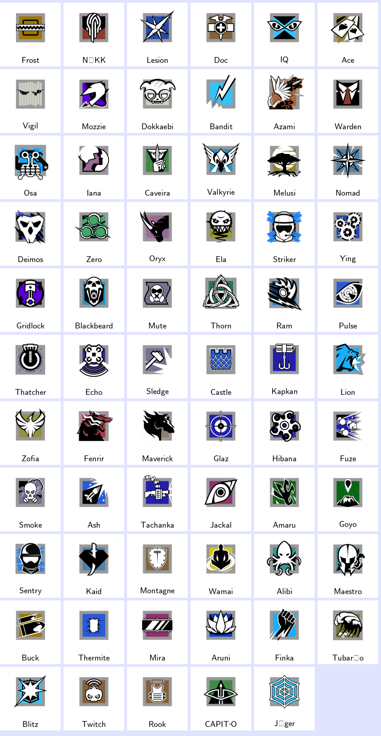Some Operators: Frost, Nokk, Lesion, Doc, Iq, Ace, Vigil, Mozzie, Dokkaebi, Bandit…