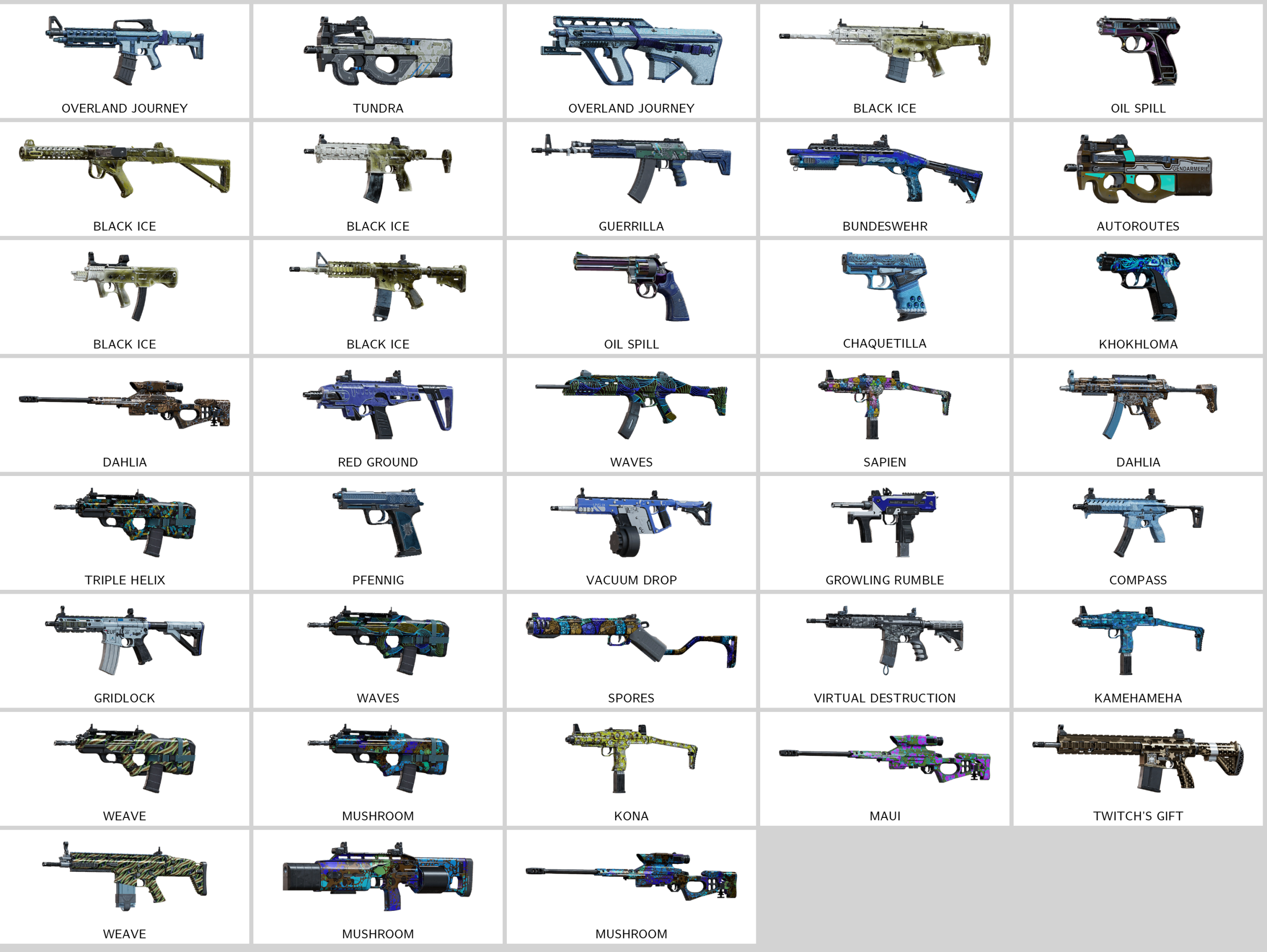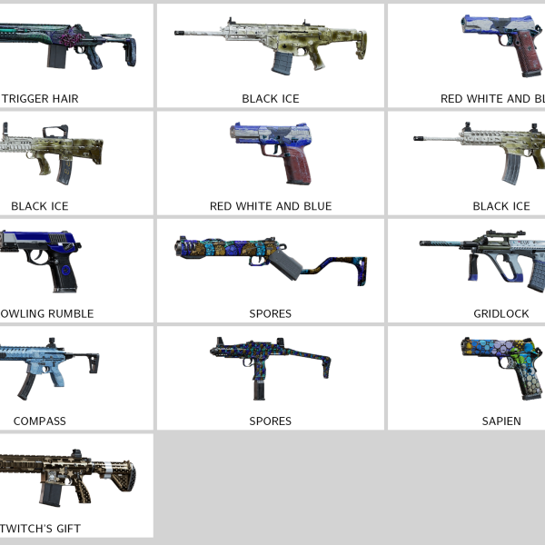 – Tundra (P90), Arctic Range (C8-SFW), Flight of Triumph (M12), Tentacle Lace (ACS12), The Old Stock (L85A2), Corinthian Coral (TCSG12)…
