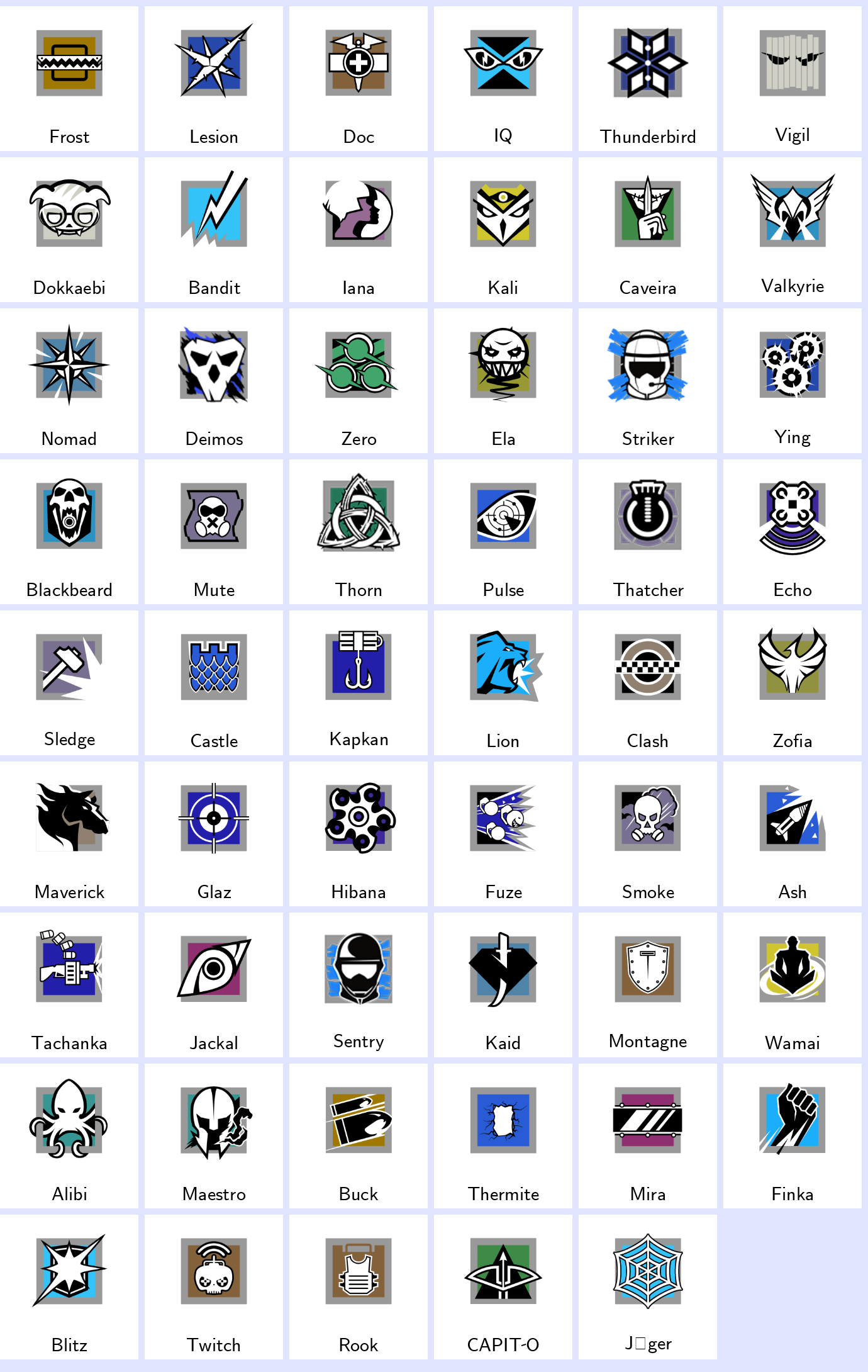 Some Operators: Frost, Lesion, Doc, Iq, Thunderbird, Vigil, Dokkaebi, Bandit, Iana, …