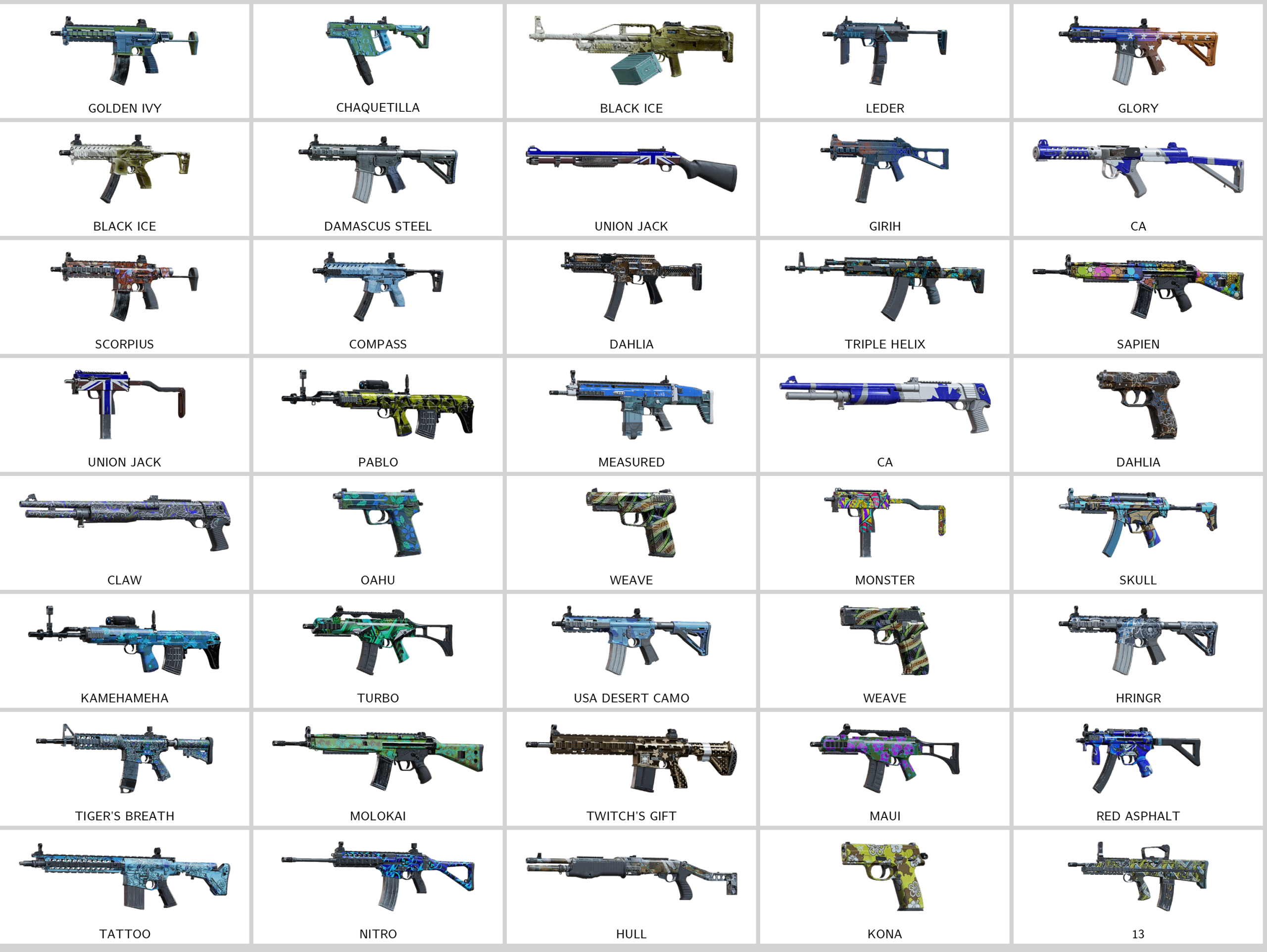 Some of Other Skins: Requin (F2), Target (R4C), Roman Ballista (ALDA 5.56), Gris Colorful (Scorpion), Trafalgar (SMG-11), Khokhloma (OTs-03), Glory (R4C), Chaquetilla (Vector)…