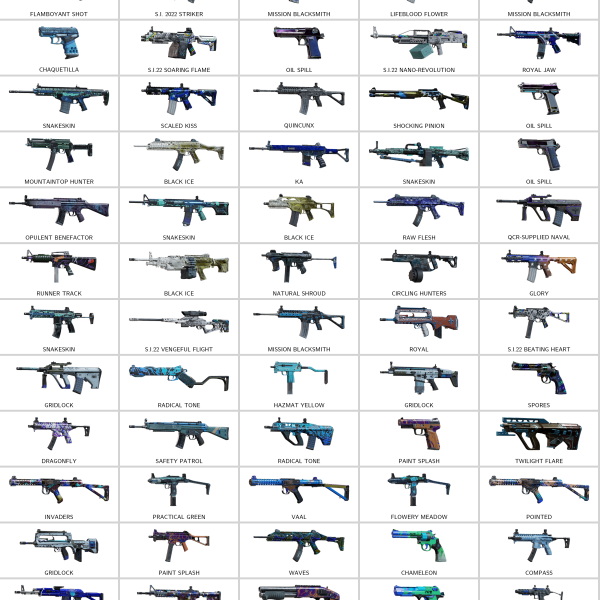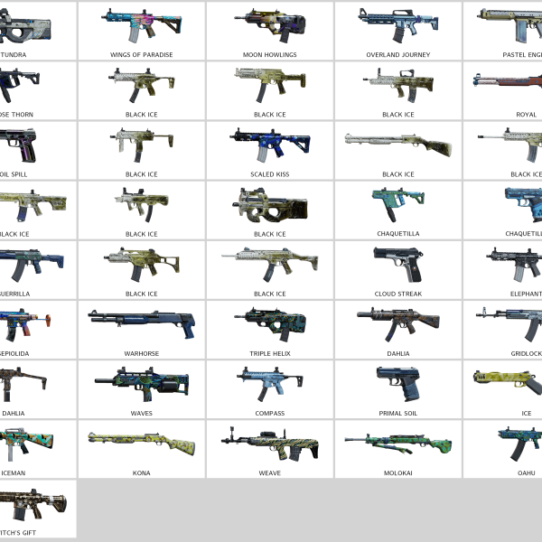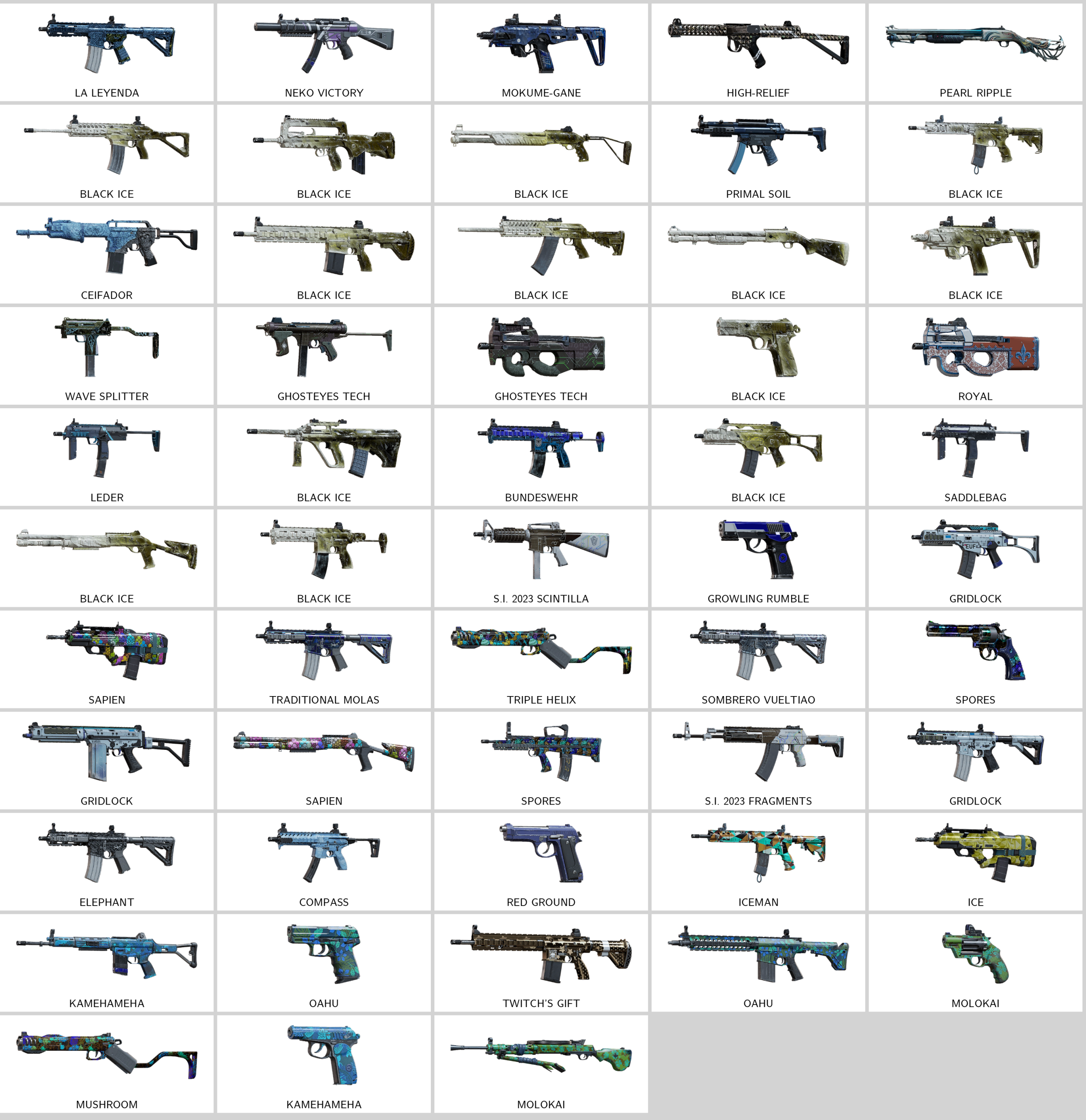 – Air Raid (CSRX300), Urban Graffiti (Type-89), Stone Talon (T-5 SMG), Neko Victory (MP5SD), Viral Douser (F2), High-relief (9mm C1)…