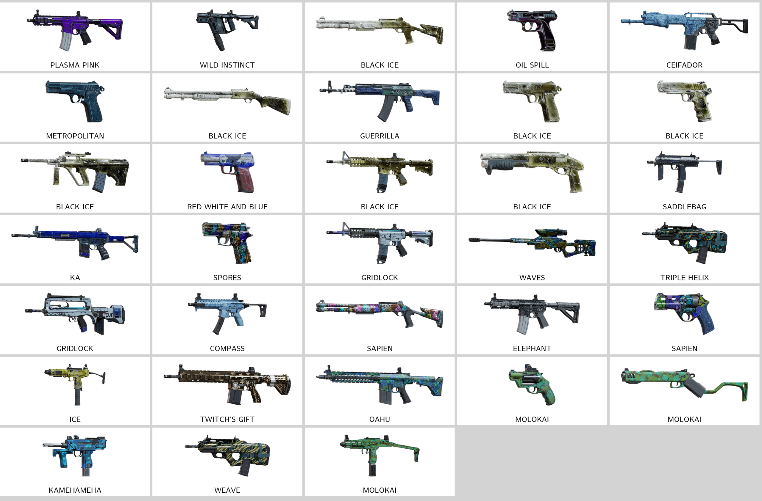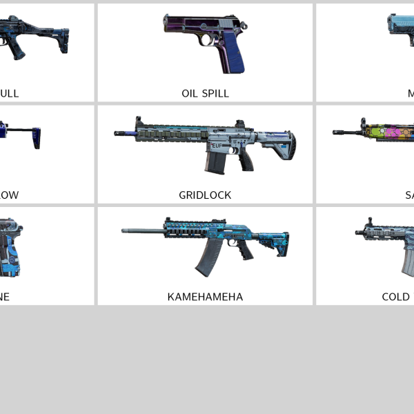 – Metallurgic Burn (9mm C1), Gritty (ITA12S), Mythical Majesty (ARX200), SWAT Flag (UMP45), Immaculate (SPSMG9), Military Tarp (AUG A3)…