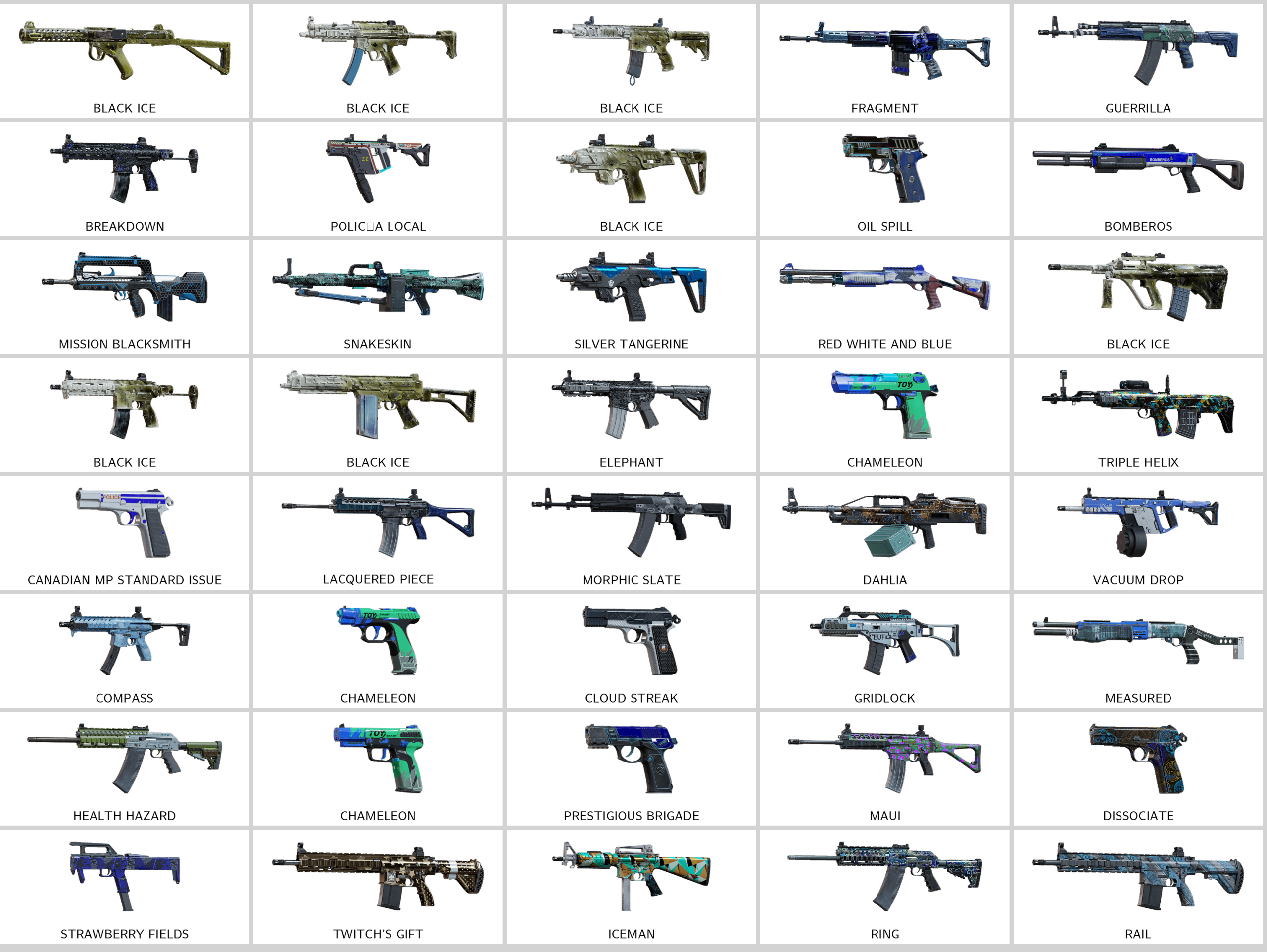 Some of Other Skins: Policía Local (Vector), Warning Bite (AR-15), Bygone Remnant (417), Target (R4C), Sunstark (V308), Silver Tangerine (P10 Roni), Snakeskin (ALDA 5.56), Mission Blacksmith (F2)…
