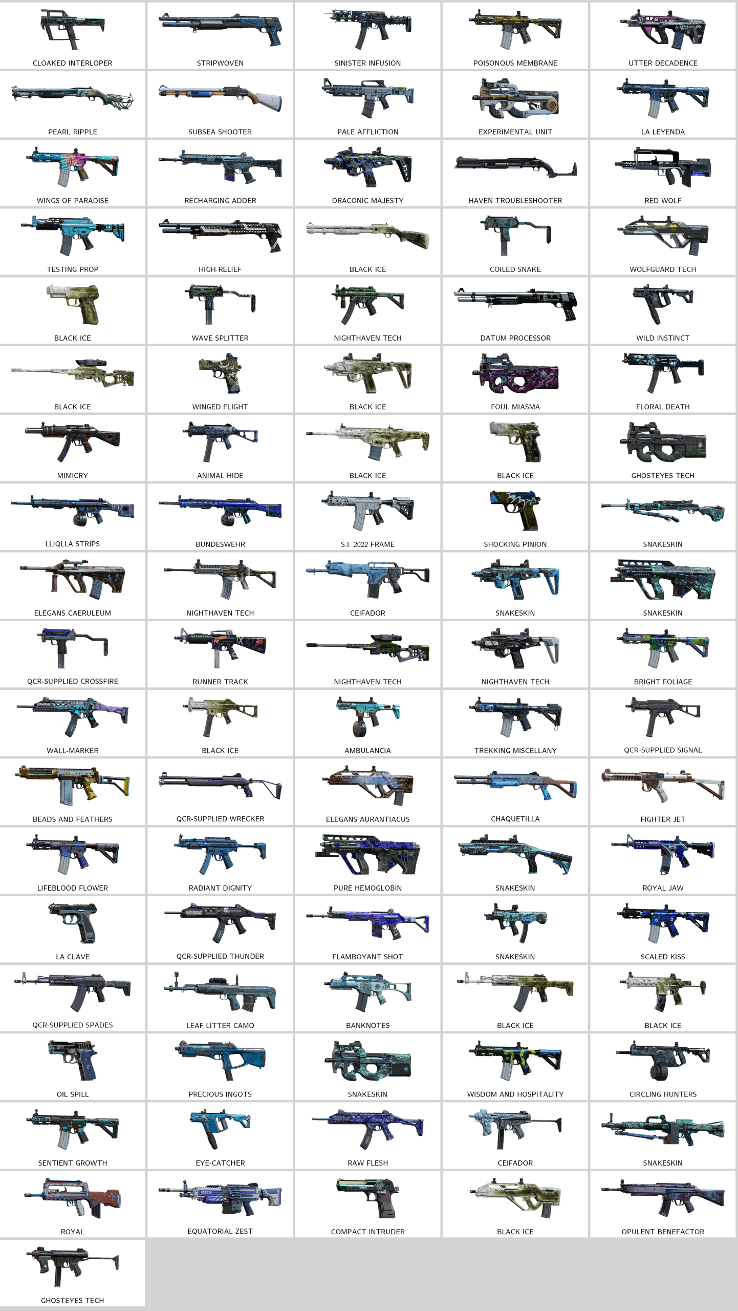 Some of Other Skins: Datum Processor (MPX), Snakeskin (P10 Roni), Predator Fate (CSRX300), Snakeskin (DP27), Elegans Caeruleum (AUG A2), S.I. 2022 Frame (R4C), Nighthaven Tech (MP5K), Winged Flight (RG15)…
