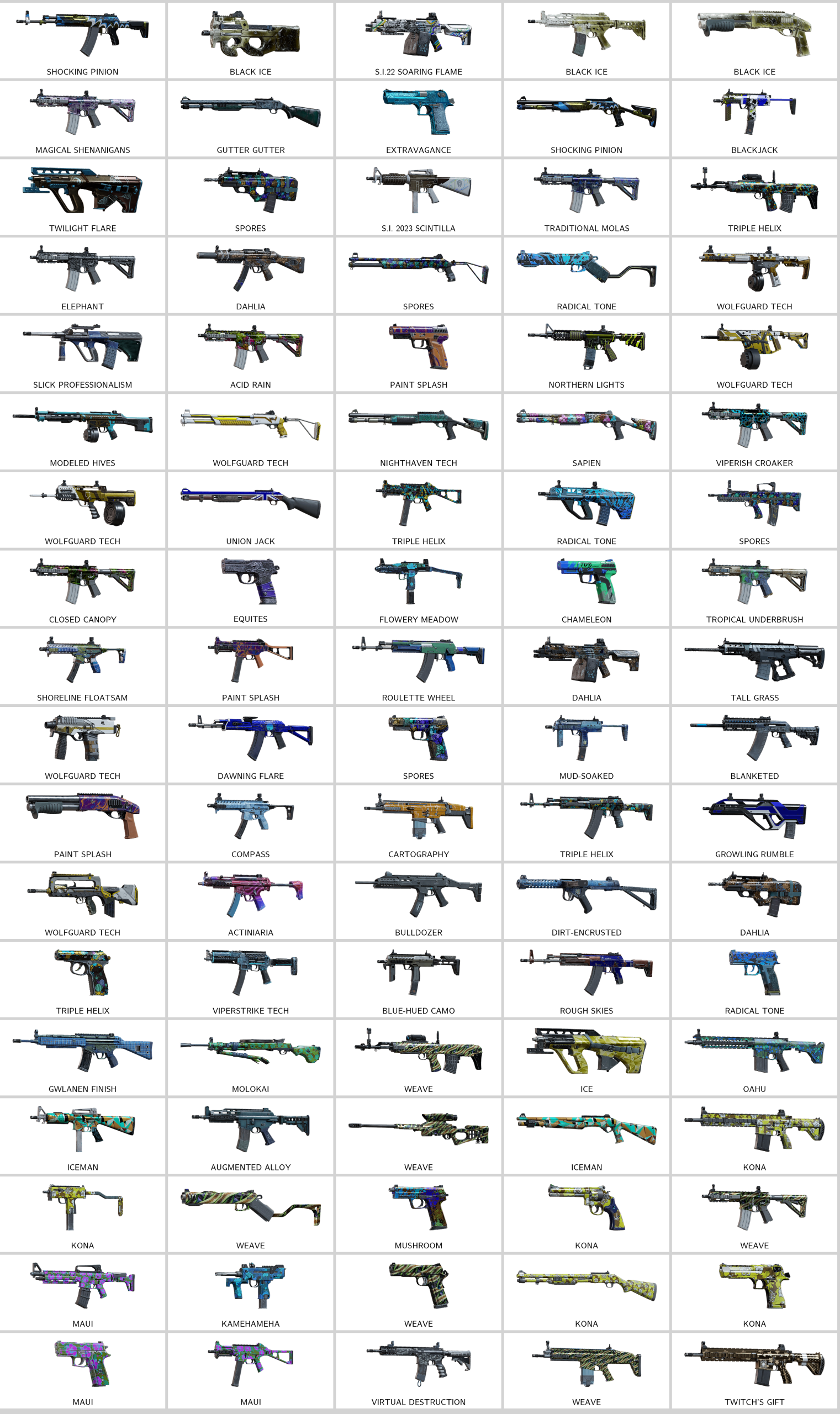 – Testing Prop (K1A), Metallurgic Burn (9mm C1), Experimental Unit (P90), Premium Snack (Mk 14 EBR), High-Relief (Super 90), Stripwoven (Super 90)…