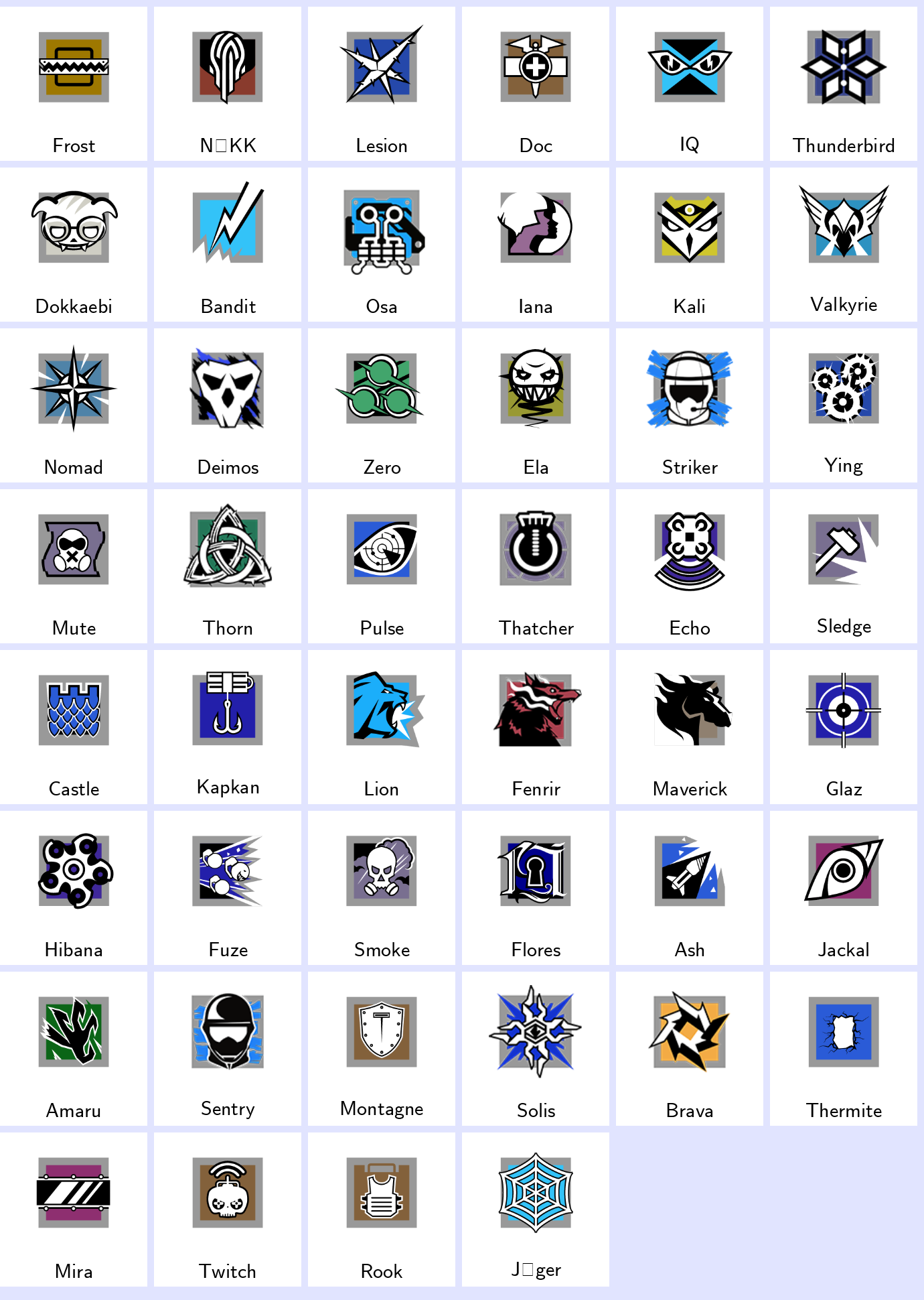 Some Operators: Frost, Nokk, Lesion, Doc, Iq, Thunderbird, Dokkaebi, Bandit, Osa, Iana…