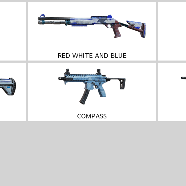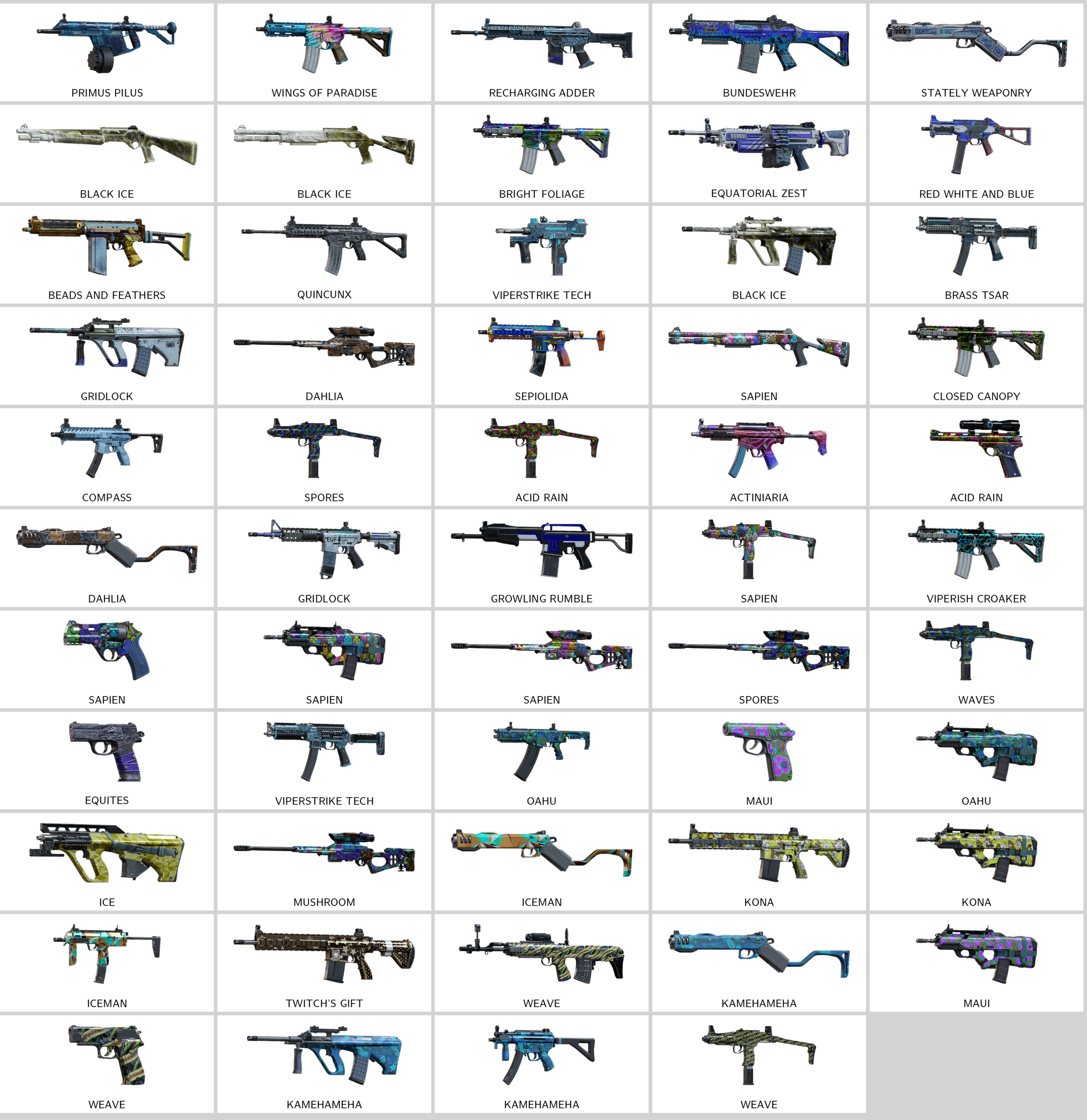 Some of Other Skins: Lacquered Elegance (F2), Gleipnir (MP7), Stately Weaponry (GONNE-6), Bundeswehr (552 Commando), Target (R4C), Amplified (SIX12), Beads And Feathers (PARA-308), Aegean Blue (T-5 SMG)…