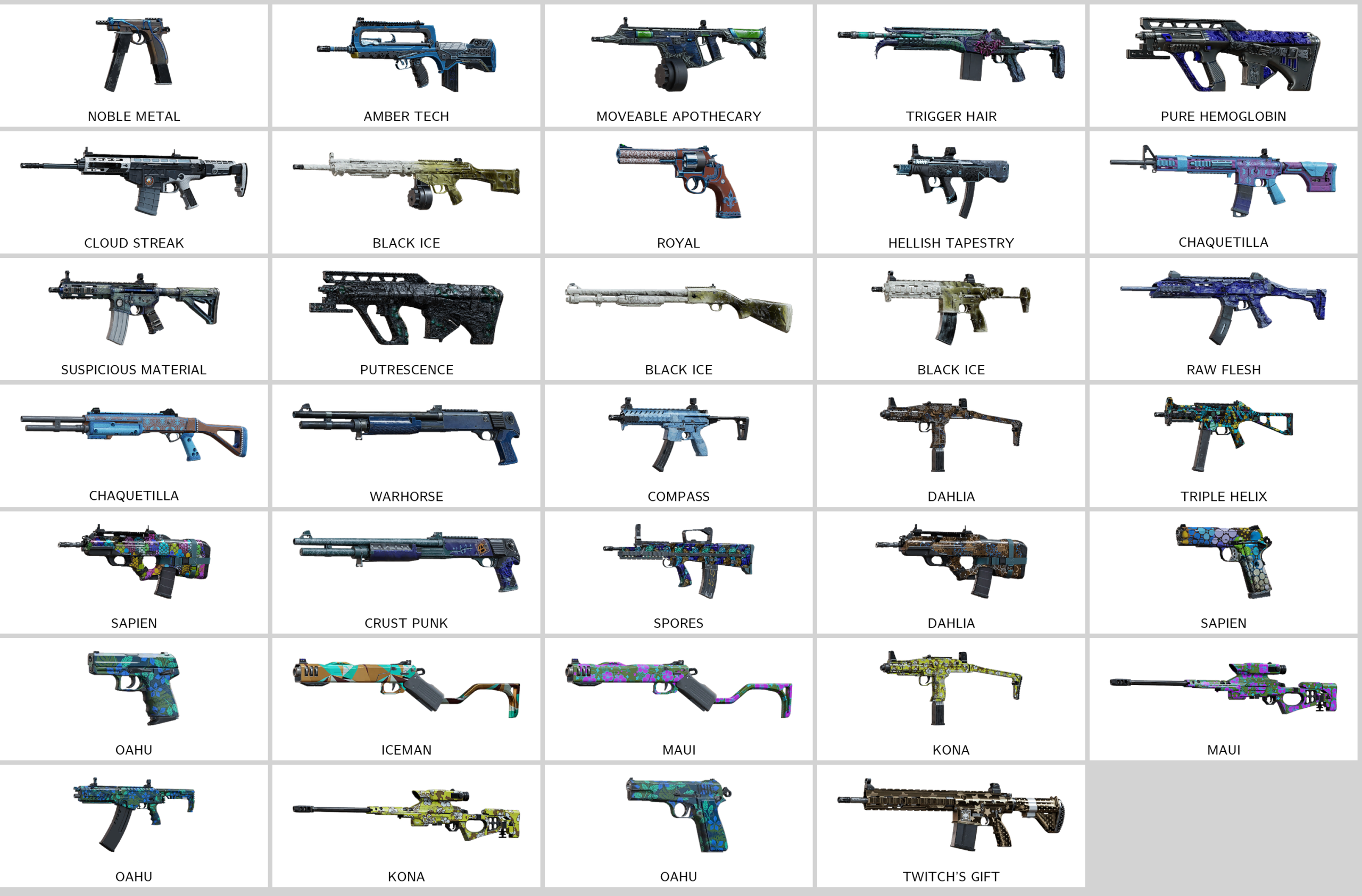 – Amber Tech (F2), Stone Talon (T-5 SMG), Subatomic Beam (556XI), Viral Douser (F2), Yeouiju (K1A), Immemorial Art (V308)…