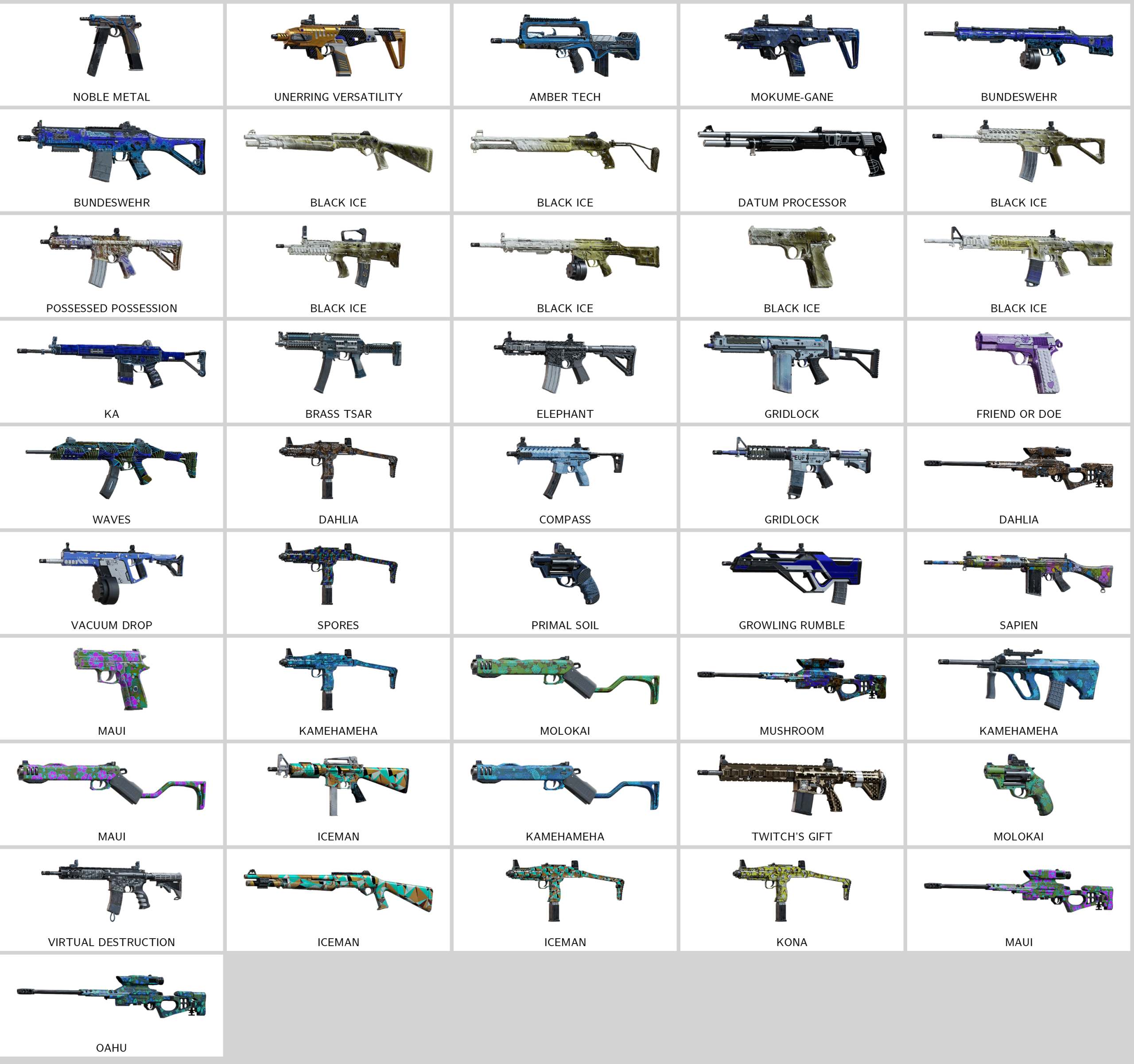 – Amber Tech (F2), Unerring Versatility (P10 Roni), Stone Talon (T-5 SMG), Viral Douser (F2), Yeouiju (K1A), Immemorial Art (V308)…