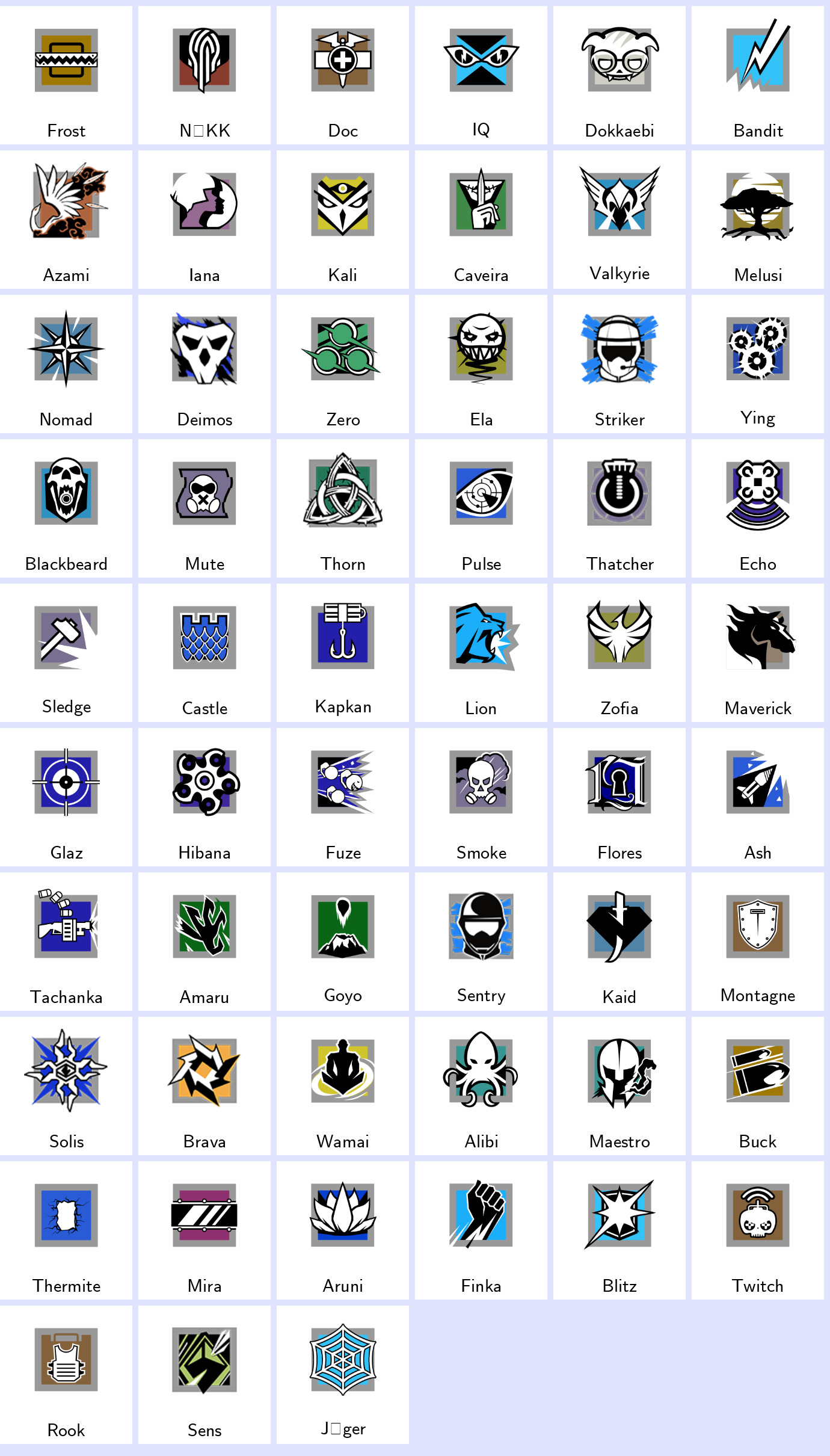 Some Operators: Frost, Nokk, Doc, Iq, Dokkaebi, Bandit, Azami, Iana, Kali, Caveira…