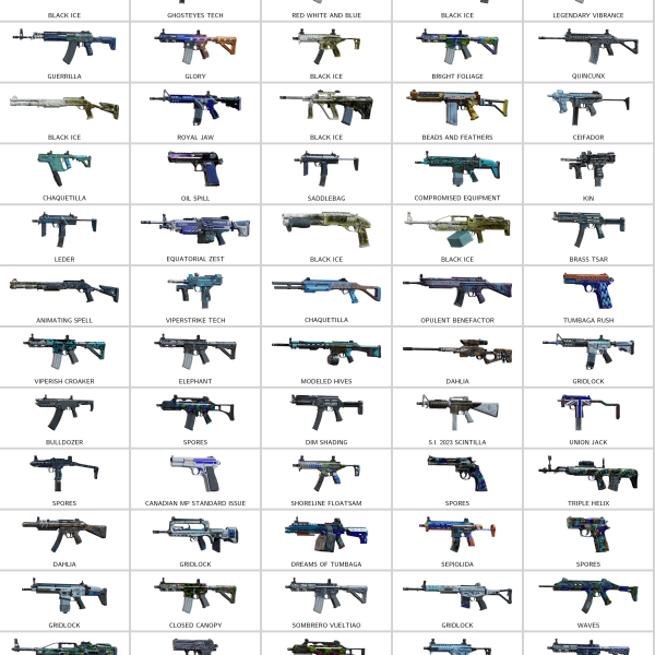 – Berber Ornaments (AK-74M), Ethereal Marksman (416-C), Arctic Range (C8-SFW), Lovelace (F2), Air Raid (CSRX300), Stone Talon (T-5 SMG)…