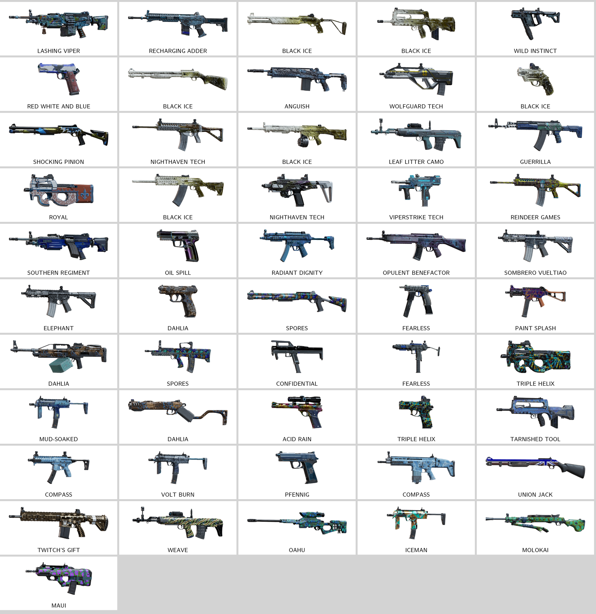 – Air Raid (CSRX300), Premium Snack (Mk 14 EBR), Immemorial Art (V308), Tentacle Lace (Mx4 Storm), Shredded Rifts (FMG-9), Recharging Adder (Type-89)