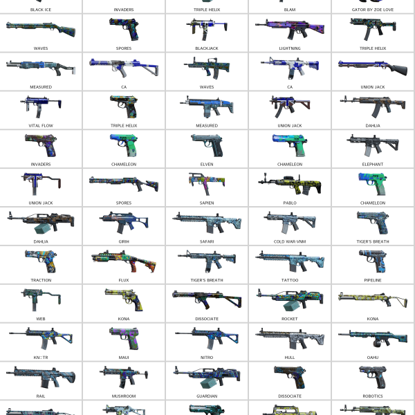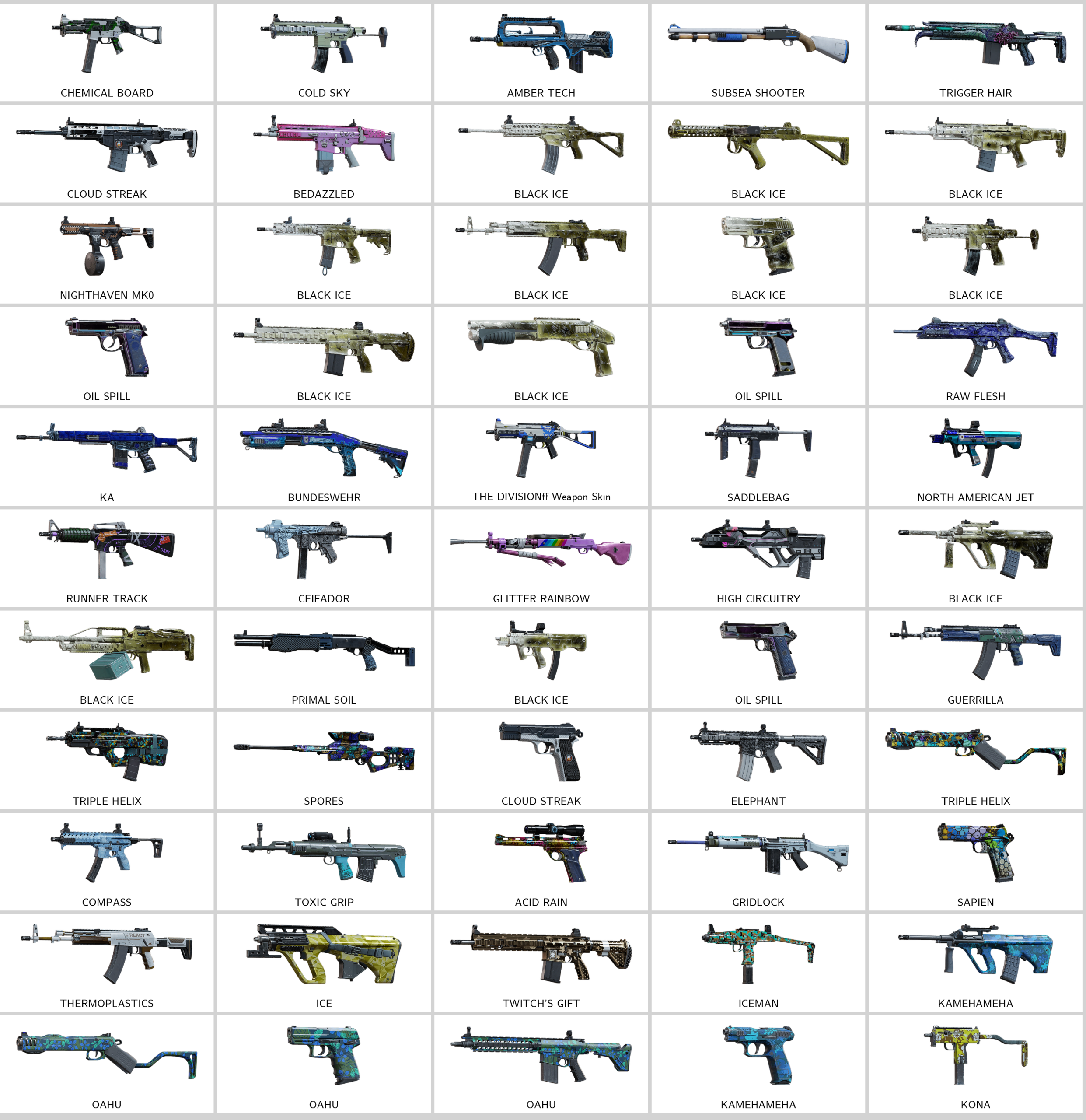 – Arctic Range (C8-SFW), Amber Tech (F2), Air Raid (CSRX300), Scavenged Wonder (PARA-308), Dark Depths (L85A2), Subatomic Beam (556XI)…