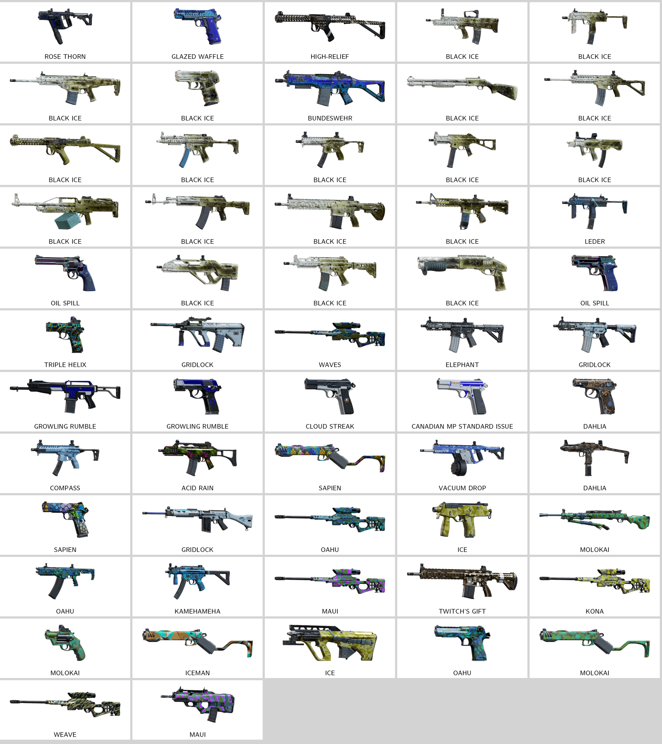 – Ethereal Marksman (416-C), Arctic Range (C8-SFW), Stone Talon (T-5 SMG), Tattered Reprisal (M12), Scavenged Wonder (CAMRS), Viral Douser (F2)…