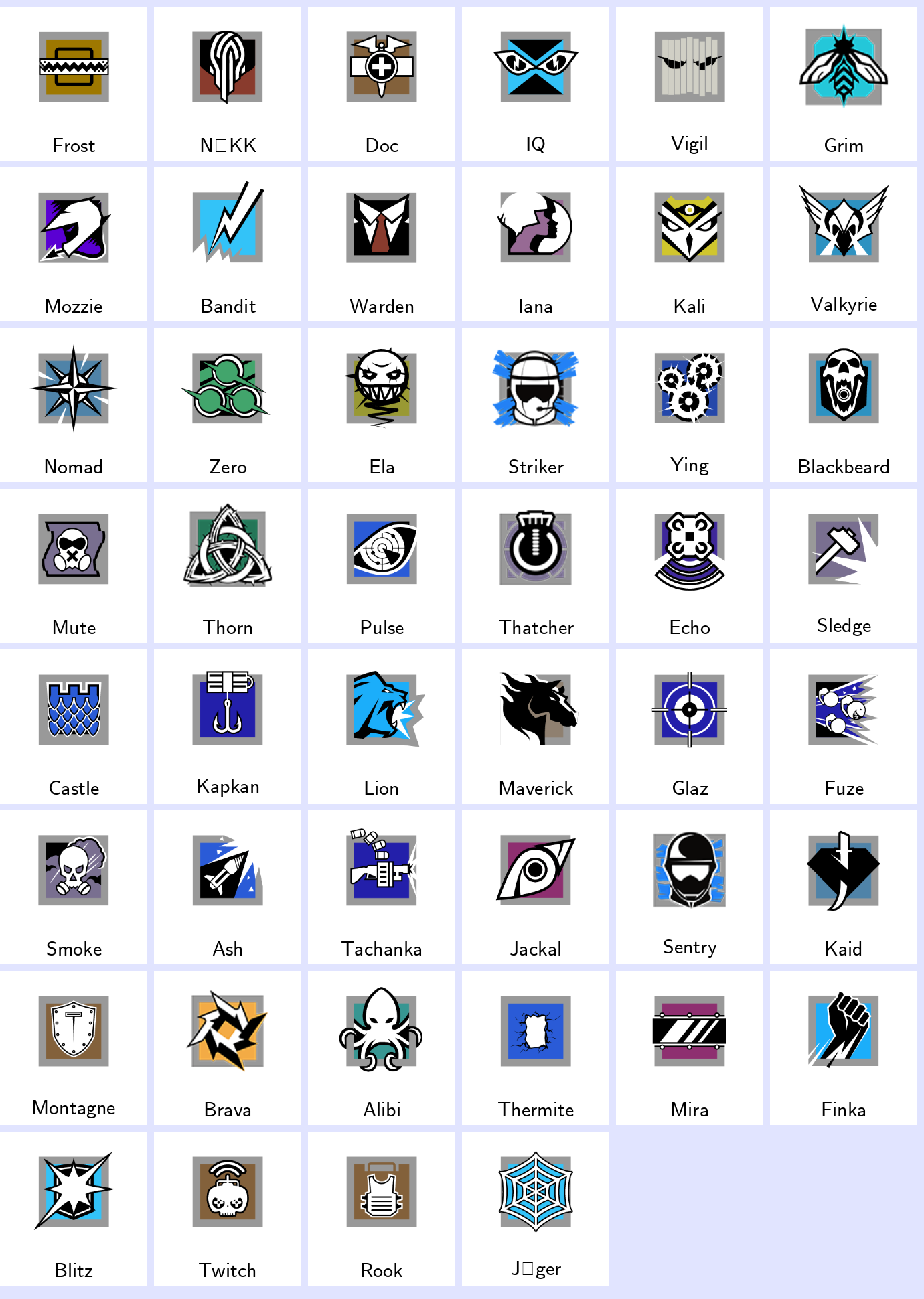 Some Operators: Frost, Nokk, Doc, Iq, Vigil, Grim, Mozzie, Bandit, Warden, Iana…