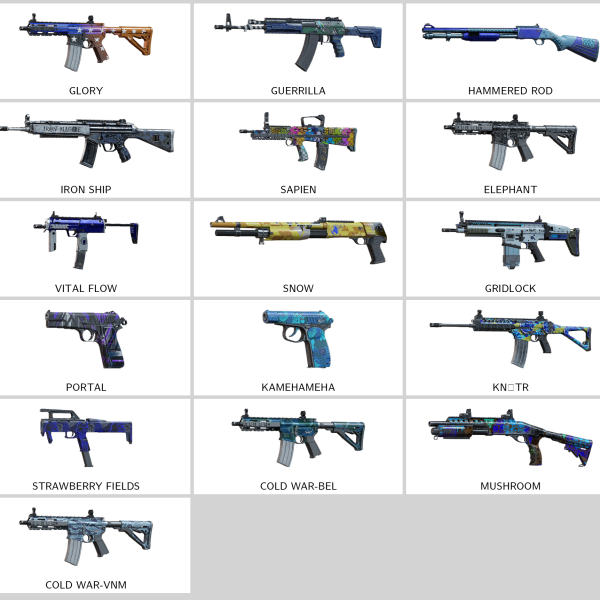 Some of Other Skins: Verkh (9x19VSN), Mission Blacksmith (556XI), Target (R4C), Loyal Forces (Mx4 Storm), Leder (552 Commando), Nighthaven Tech (P10 Roni), Khokhloma (9x19VSN), Moku (P229)…
