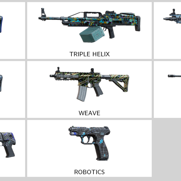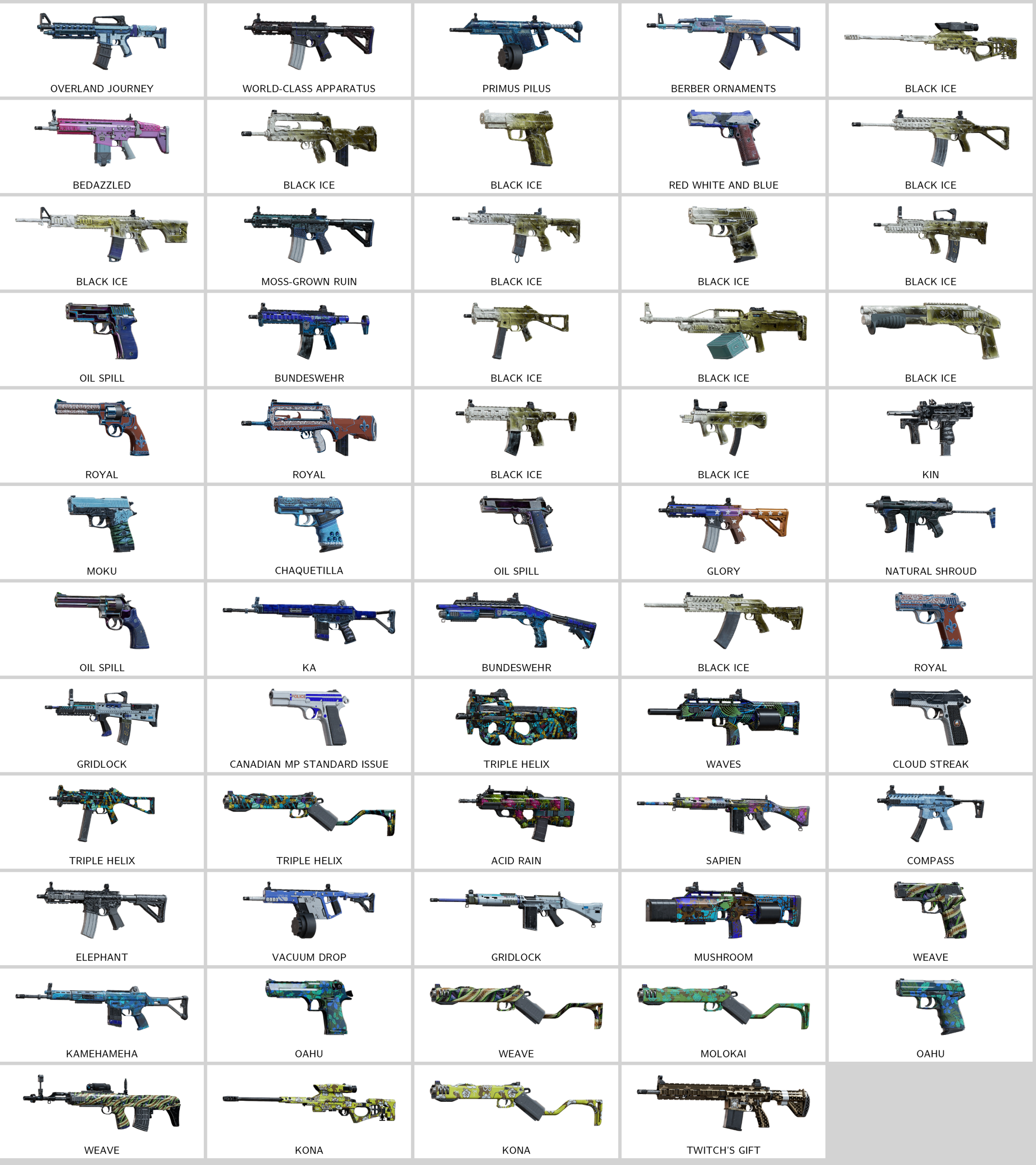 Some Skins: Triple Helix, Oahu, Gridlock, Cloud Streak, Kamehameha, Waves, Black Ice, Kona, Kin, Vacuum Drop, Bedazzled, Oil Spill, Berber Ornaments, Sapien, Primus Pilus, Twitch’S Gift, Elephant, Molokai, Ka, Moss-Grown Ruin, Moku, World-Class Apparatus, Canadian Mp Standard Issue, Glory, Compass, Overland Journey, Acid Rain, Red White And Blue, Royal, Mushroom, Bundeswehr, Chaquetilla, Natural Shroud, Weave