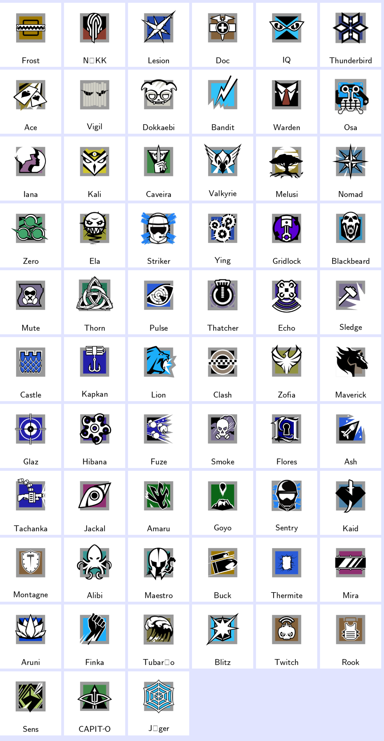 Some Operators: Frost, Nokk, Lesion, Doc, Iq, Thunderbird, Ace, Vigil, Dokkaebi, Bandit…
