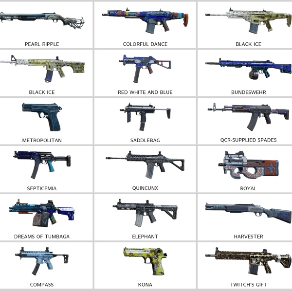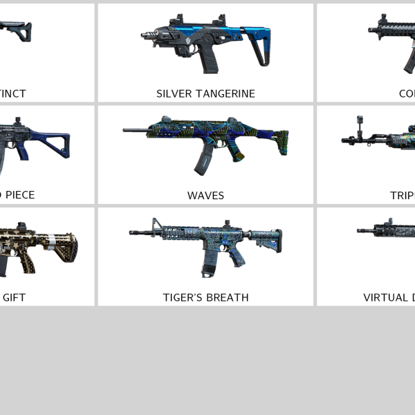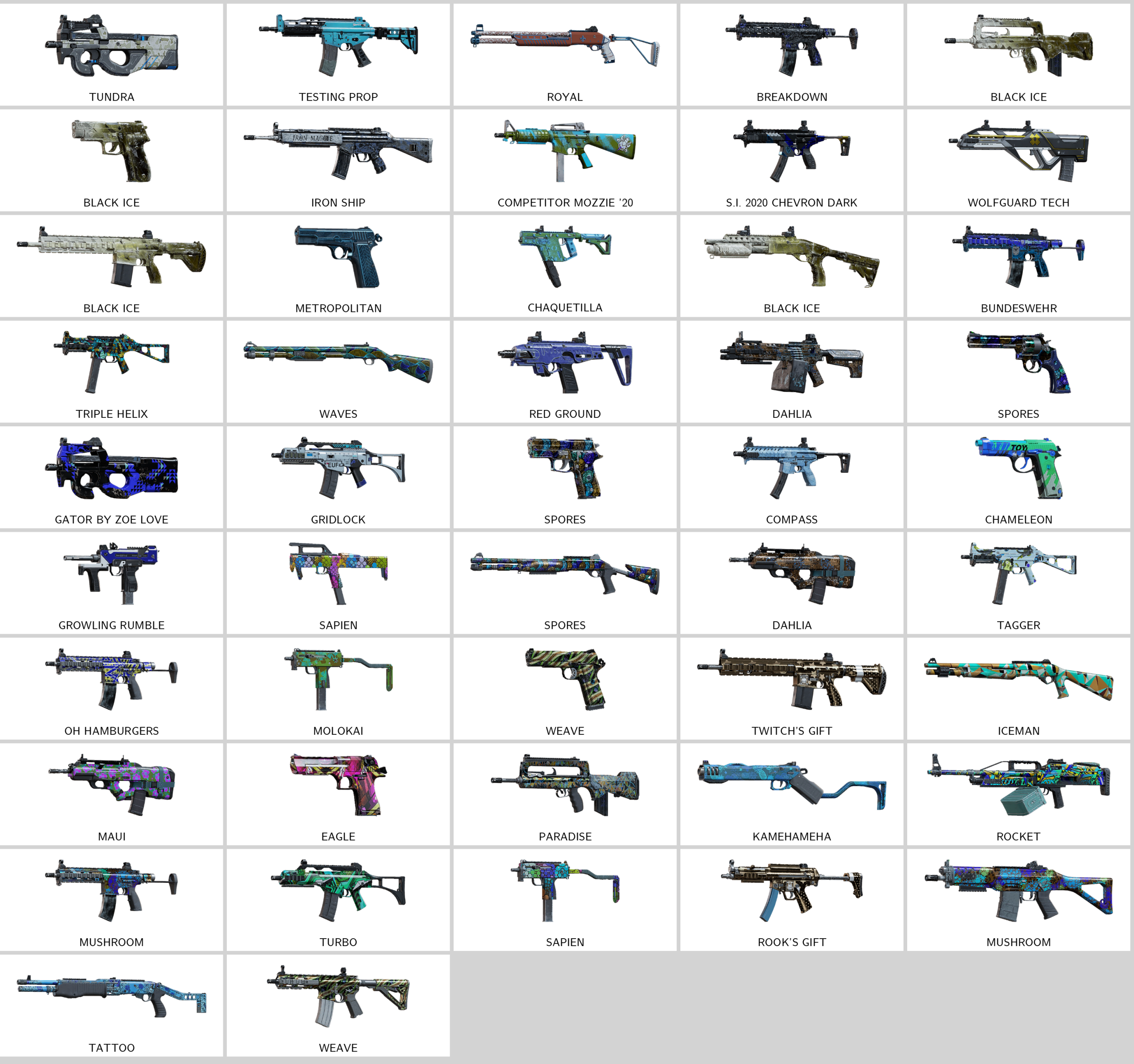 – Testing Prop (K1A), Tundra (P90), Air Raid (CSRX300), Urban Graffiti (Type-89), Stone Talon (T-5 SMG), Viral Douser (F2)…
