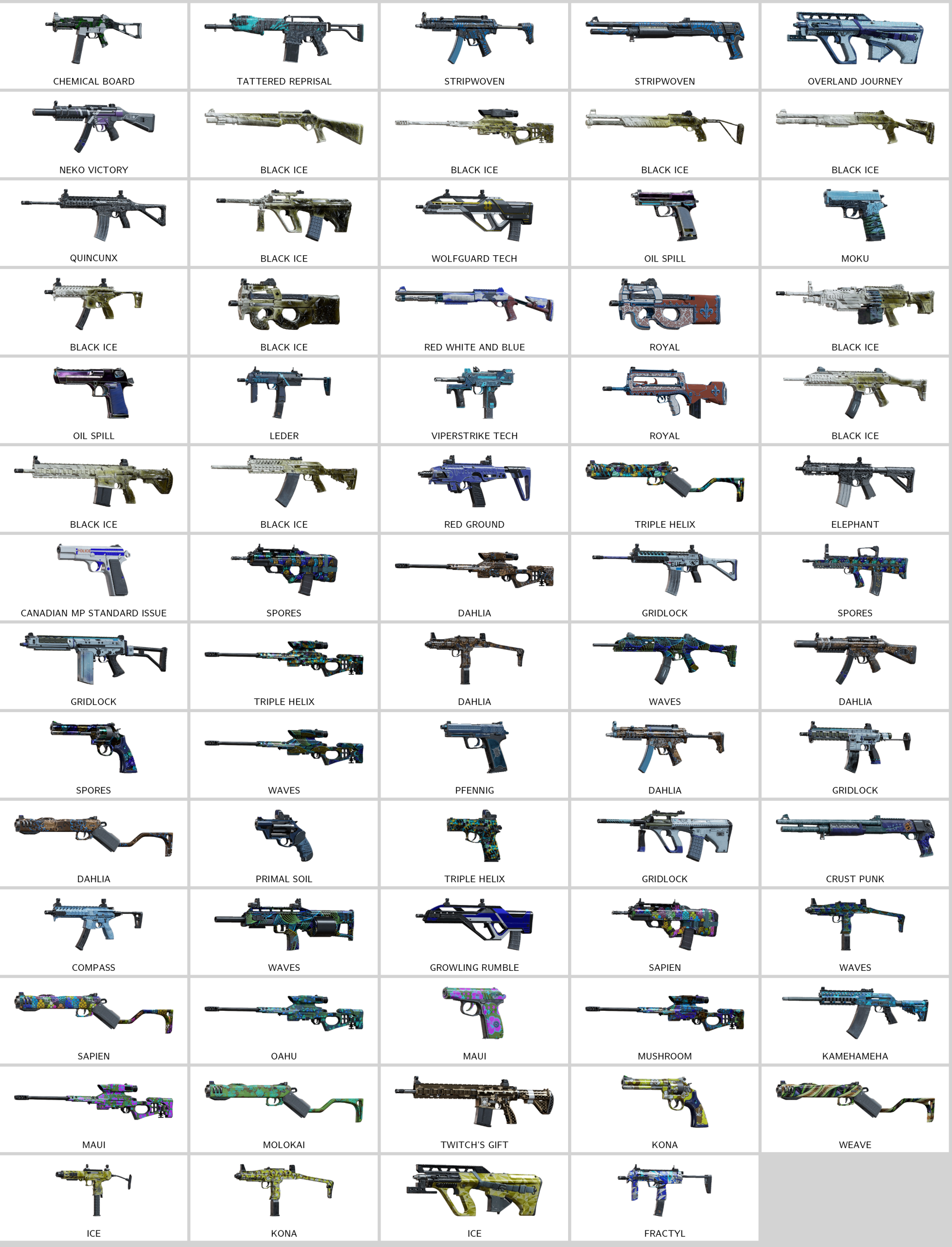 – Ethereal Marksman (416-C), Air Raid (CSRX300), Stone Talon (T-5 SMG), Unbreakable Shine (CSRX300), Neko Victory (MP5SD), Stripwoven (Super 90)…