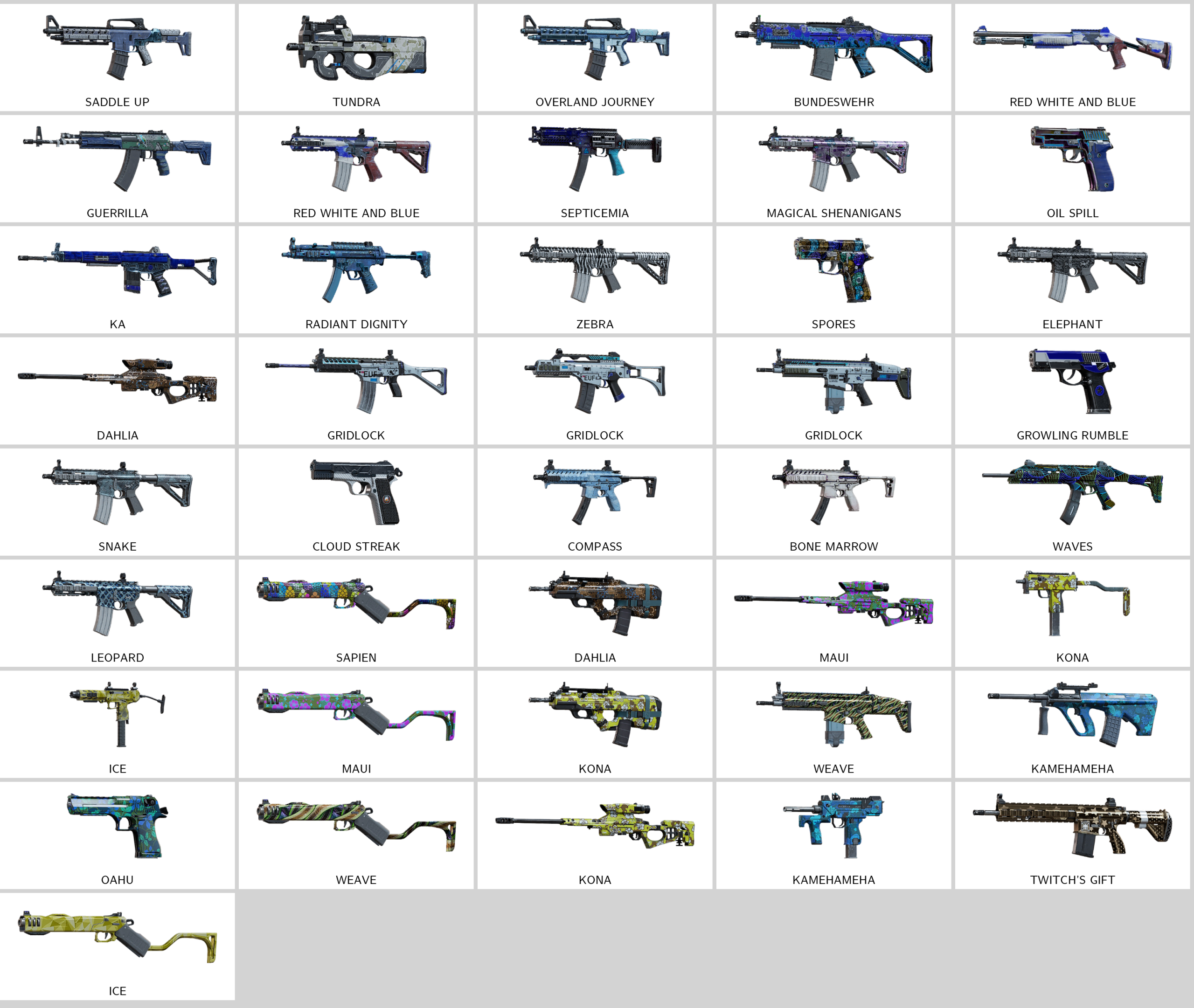 – Tundra (P90), Ethereal Marksman (416-C), Dark Depths (L85A2), Saddle Up (TCSG12), Maximized Design (M1014), Overland Journey (TCSG12)…