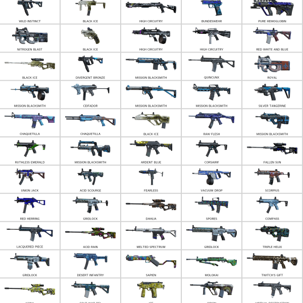 Some of Other Skins: Verkh (9x19VSN), Blaze (CAMRS), Target (R4C), Decals (417), Bundeswehr (416-C), Broadway (P226), Oil Spill (5.7 USG), Royal (F2)…