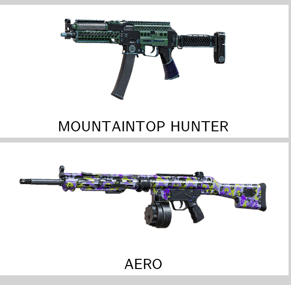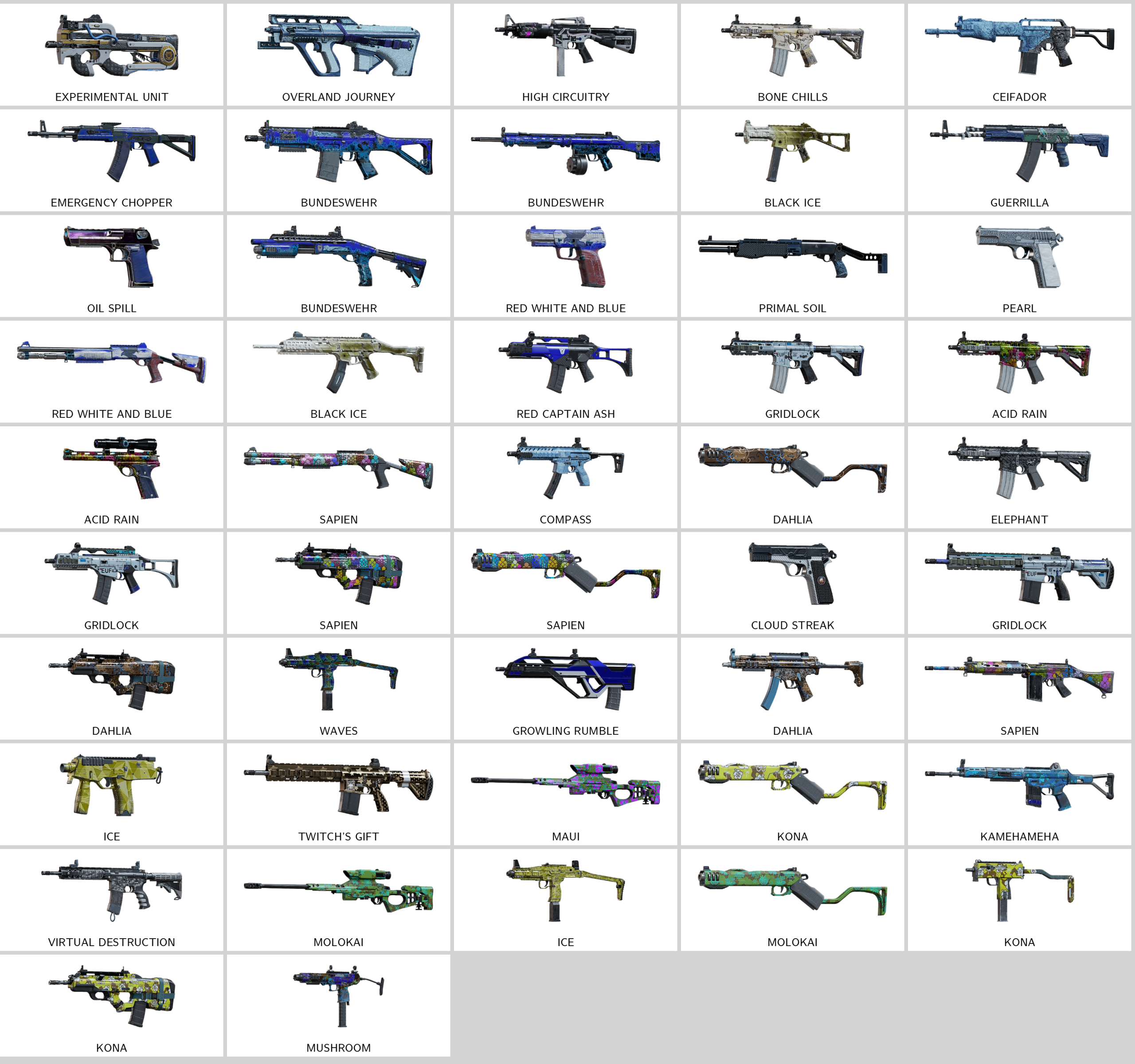 – Subatomic Beam (PDW9), Ethereal Marksman (416-C), Experimental Unit (P90), Air Raid (CSRX300), Scavenged Wonder (PARA-308), Yeouiju (K1A)…