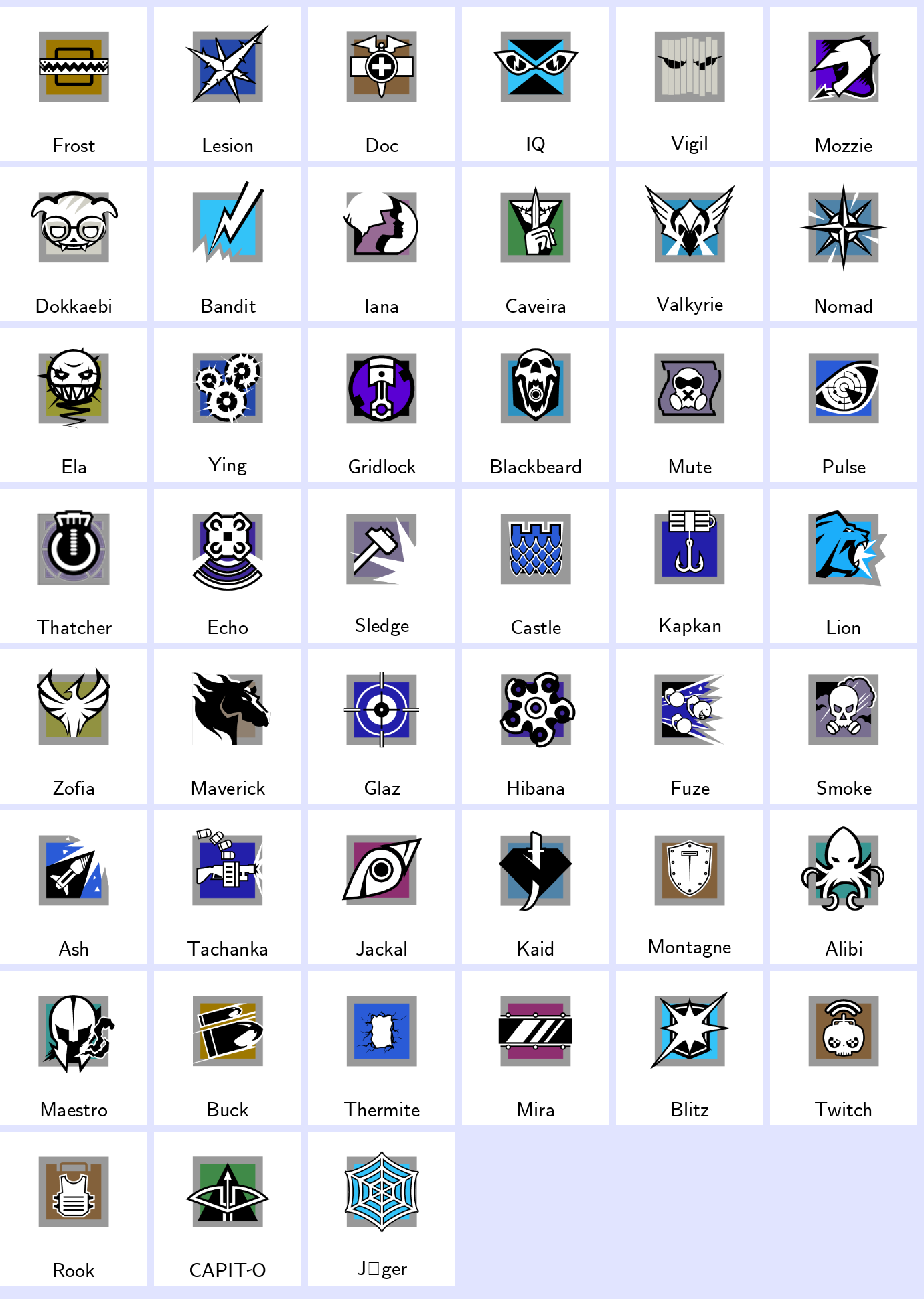 Some Operators: Frost, Lesion, Doc, Iq, Vigil, Mozzie, Dokkaebi, Bandit, Iana, Caveira…