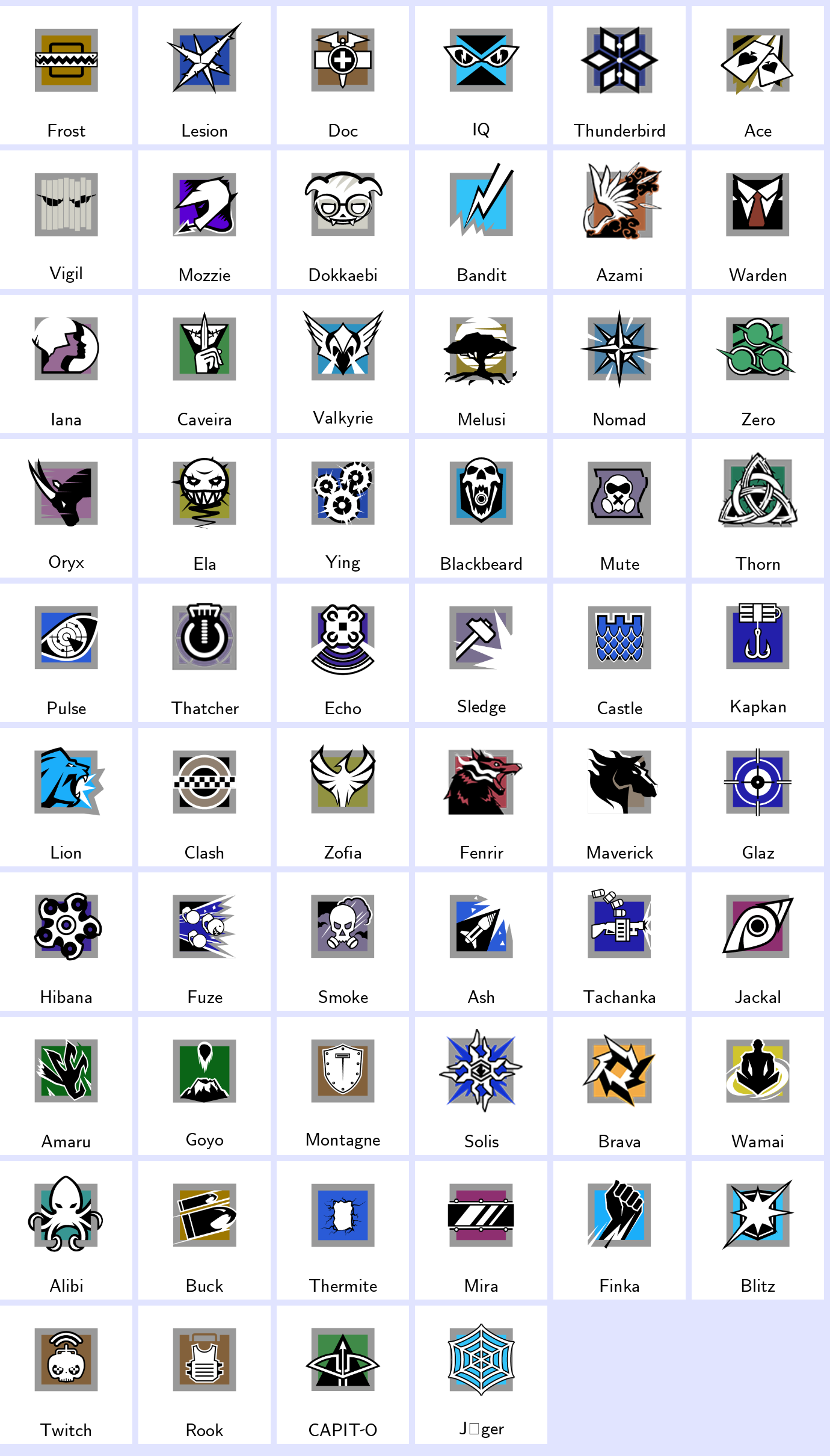 Some Operators: Frost, Lesion, Doc, Iq, Thunderbird, Ace, Vigil, Mozzie, Dokkaebi, Bandit…