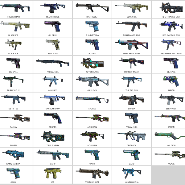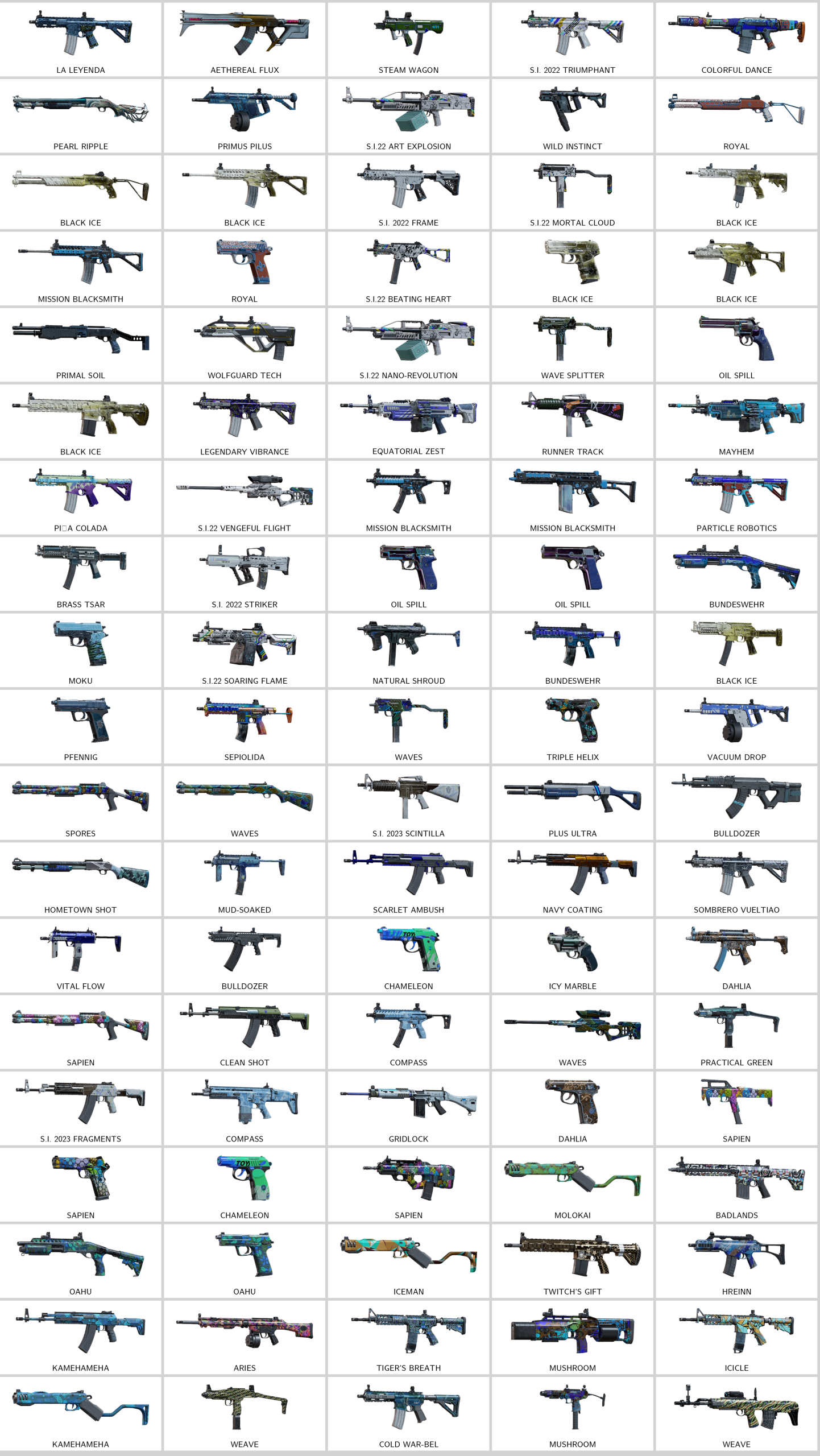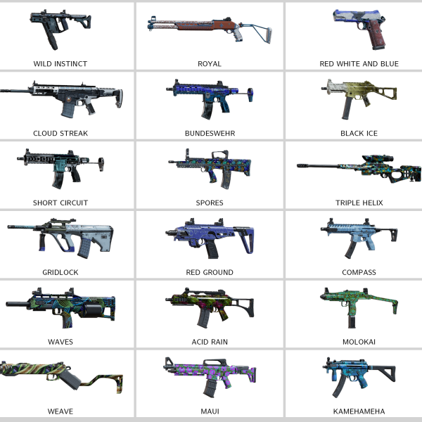 Some of Other Skins: Verkh (9x19VSN), Mission Blacksmith (556XI), SI22 Mortal Cloud (SMG-11), S.I. 2022 Frame (R4C), Royal (SG-CQB), Wild Instinct (Vector), Fray Instrument (FMG-9), SI22 Art Explosion (FO-12)…