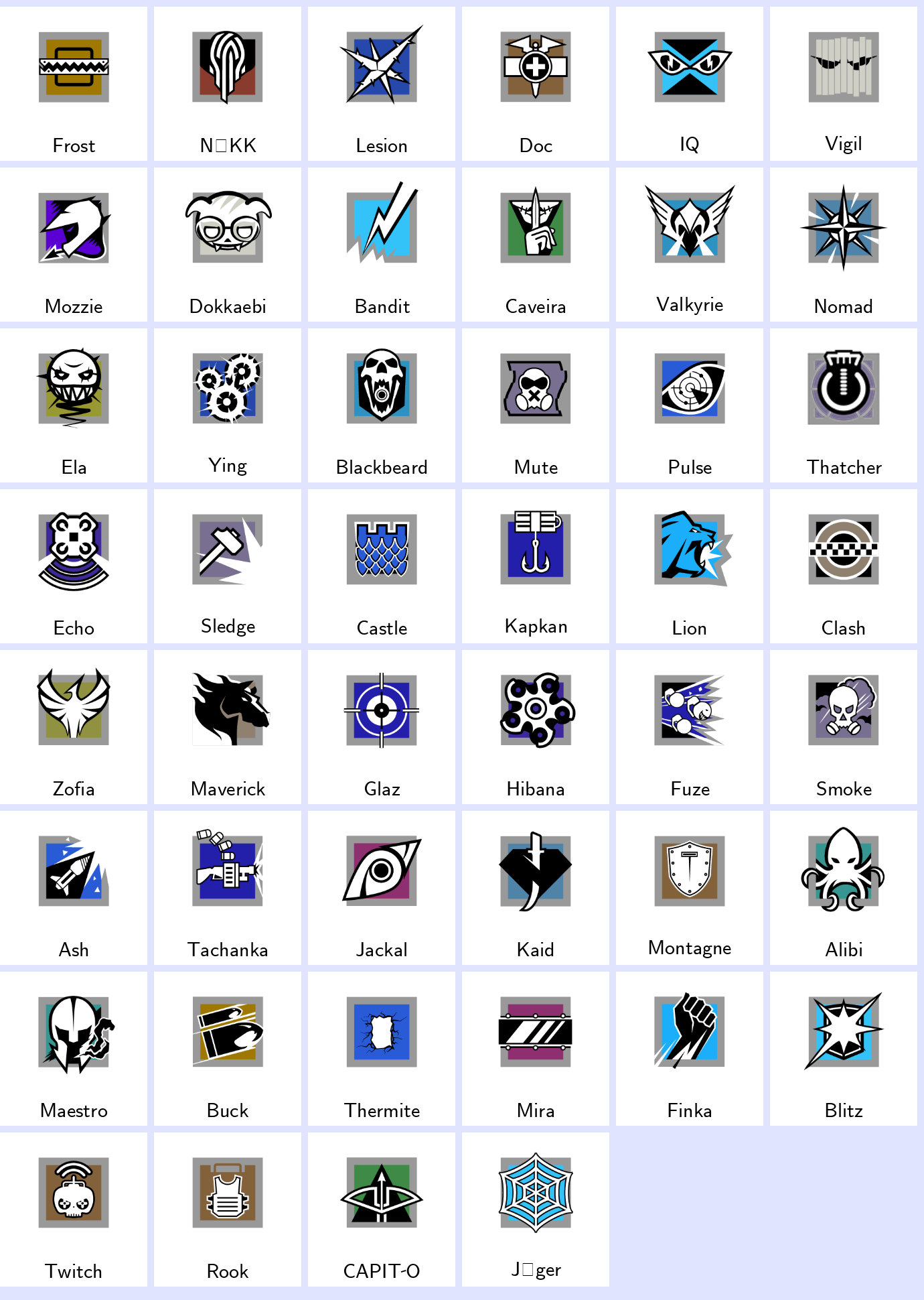 Some Operators: Frost, Nokk, Lesion, Doc, Iq, Vigil, Mozzie, Dokkaebi, Bandit, Caveira…