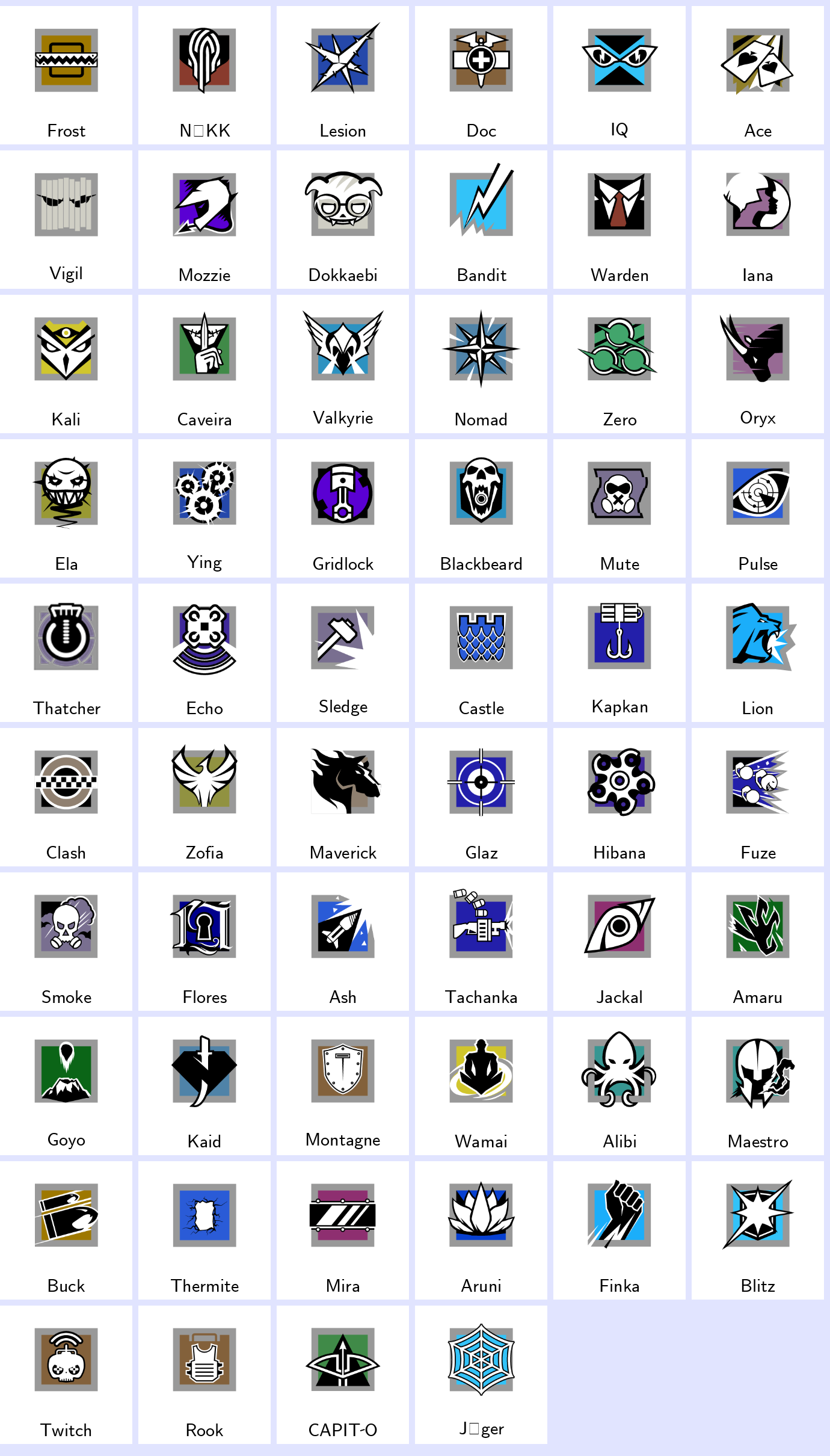 Some Operators: Frost, Nokk, Lesion, Doc, Iq, Ace, Vigil, Mozzie, Dokkaebi, Bandit…