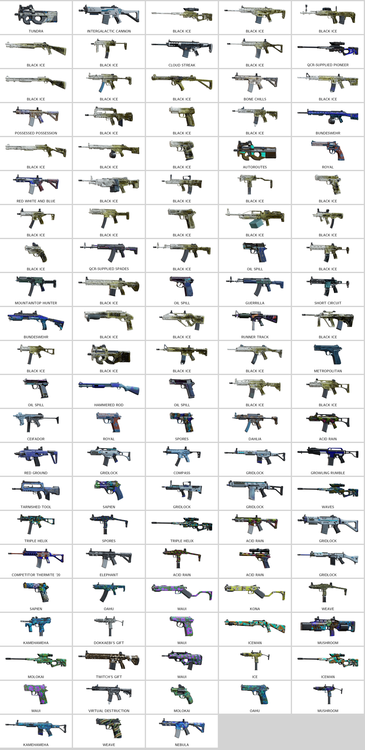 – Subatomic Beam (PDW9), Tundra (P90), Ethereal Marksman (416-C), Arctic Range (C8-SFW), Flight of Triumph (M12), Metallurgic Burn (9mm C1)…