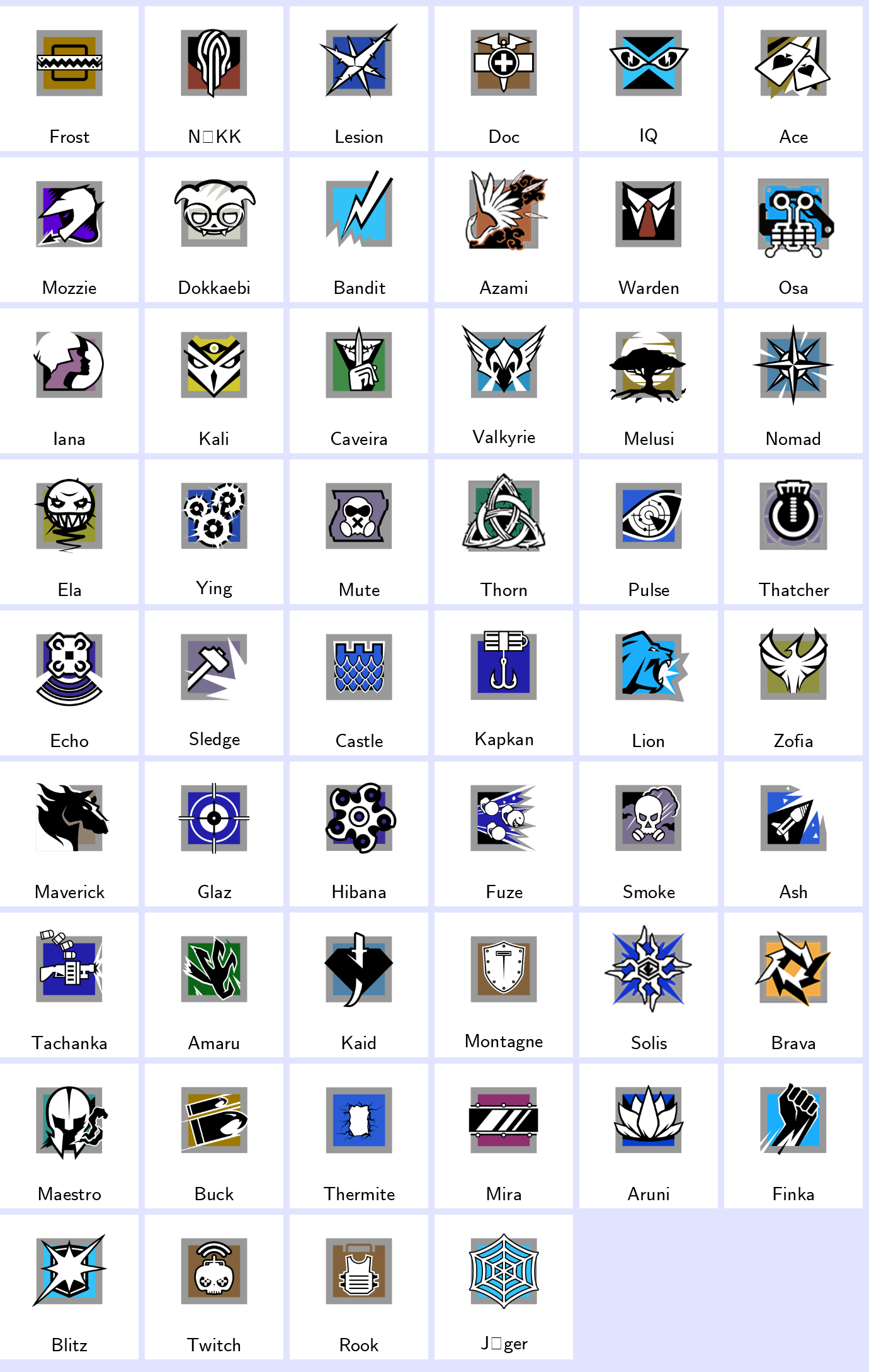 Some Operators: Frost, Nokk, Lesion, Doc, Iq, Ace, Mozzie, Dokkaebi, Bandit, Azami…