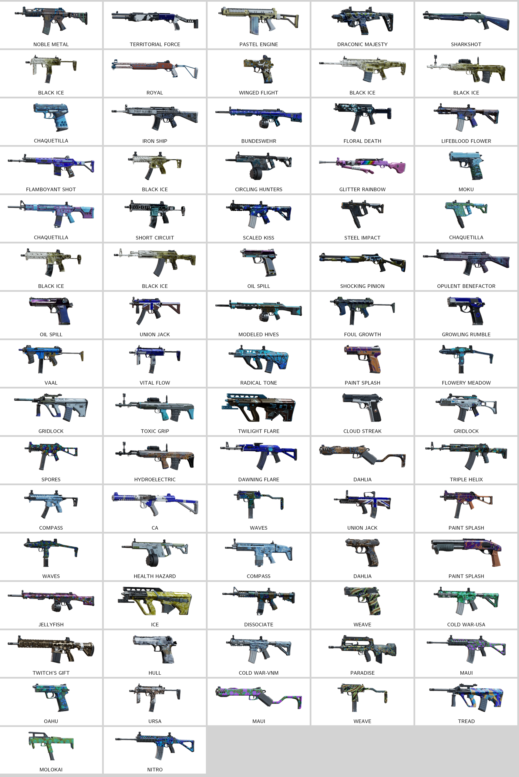 – Territorial Force (SPAS-12), Noble Metal (K1A), Fit and Finish (P9), 54th Light (C7E), Pastel Engine (PARA-308), Draconic Majesty (P10 Roni)