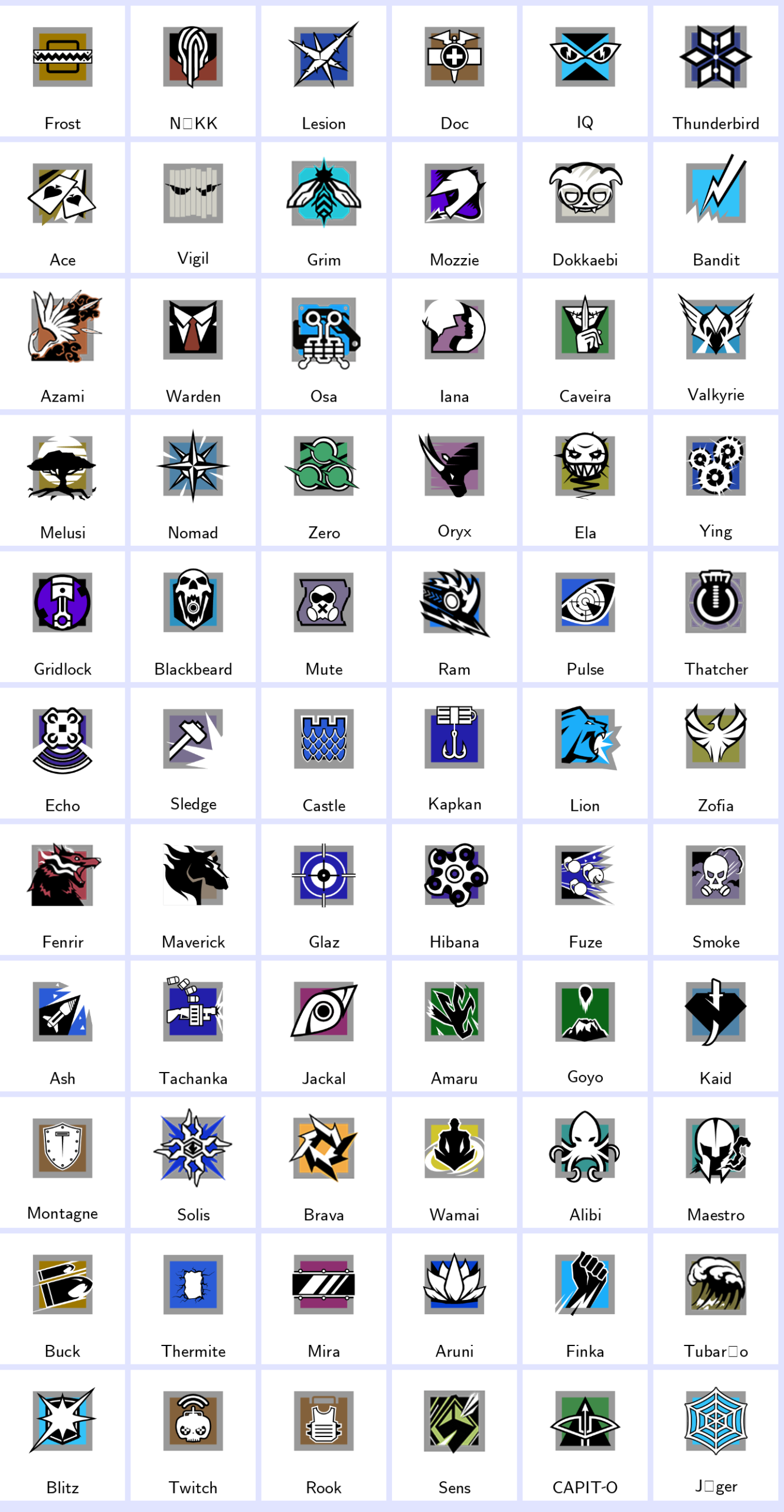 Some Operators: Frost, Nokk, Lesion, Doc, Iq, Thunderbird, Ace, Vigil, Grim, Mozzie…