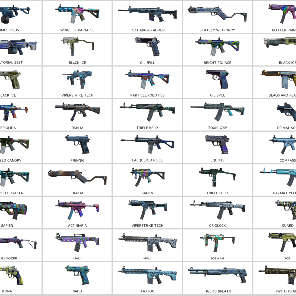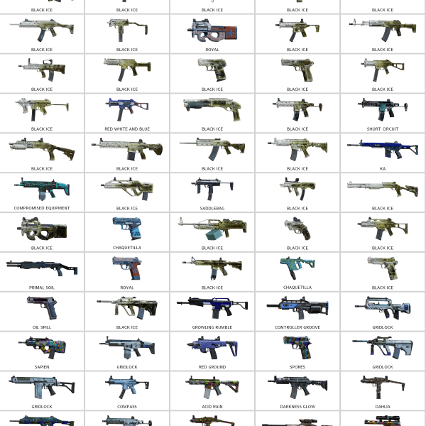 – Metallurgic Burn (9mm C1), Air Raid (CSRX300), Urban Graffiti (Type-89), Tentacle Lace (ACS12), Stone Talon (T-5 SMG), Unbreakable Shine (CSRX300)…