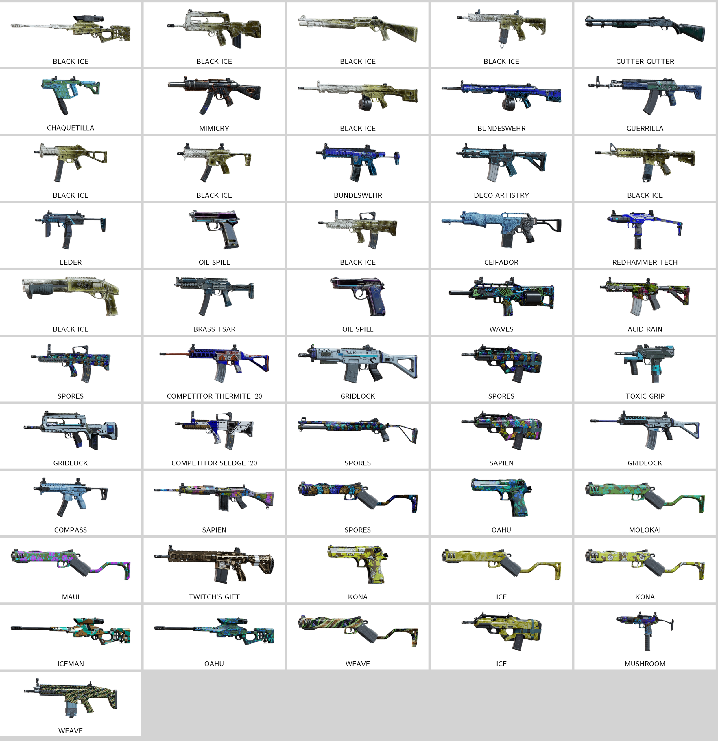 – Ethereal Marksman (416-C), Arctic Range (C8-SFW), Flight of Triumph (M12), Tentacle Lace (ACS12), Scavenged Wonder (PARA-308), The Old Stock (L85A2)…