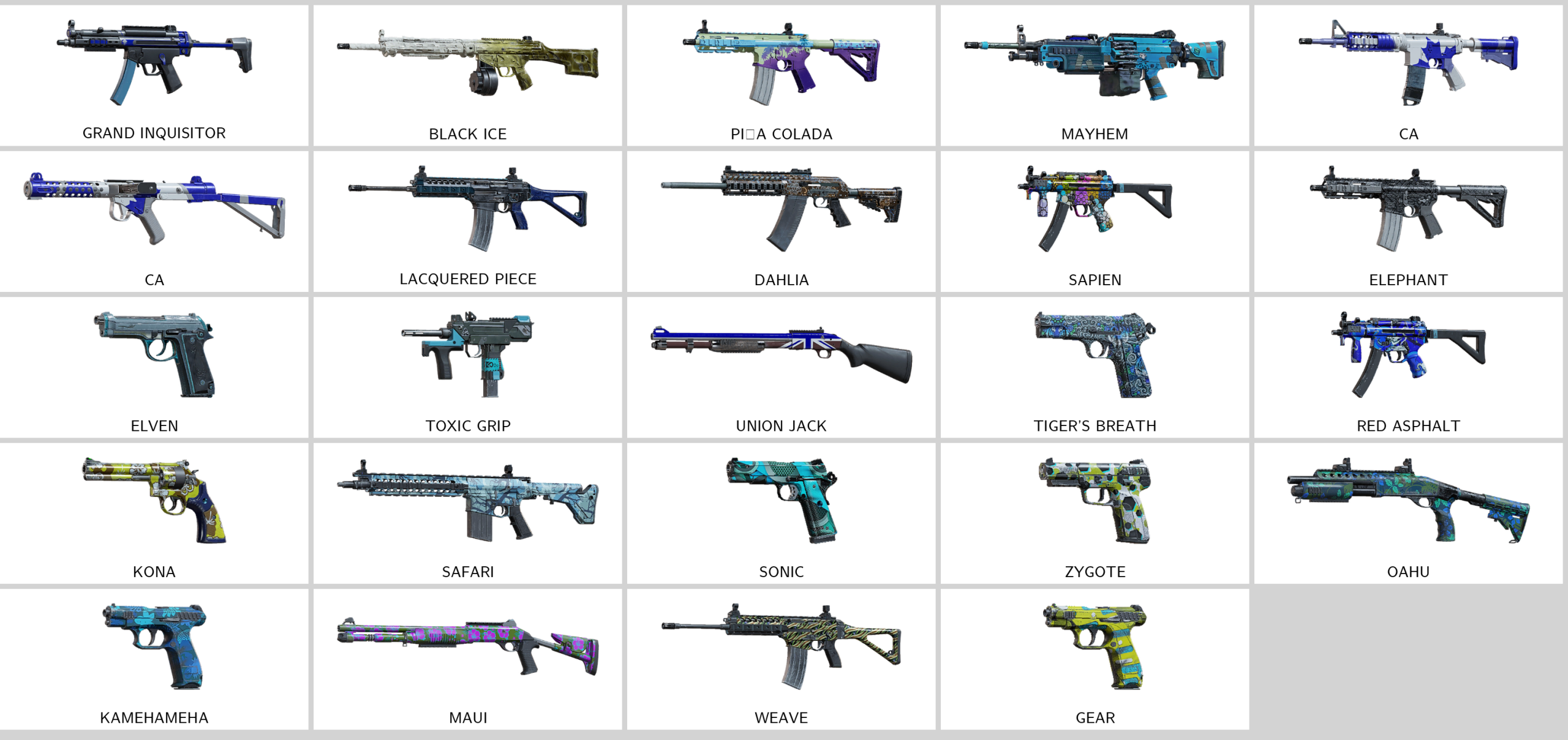 Some of Other Skins: Target (R4C), Ceifador (PARA-308), Leder (G8A1), Pina Colada (R4C), Glory (G36C), Mayhem (M249), Spores (R4C), Ca (9mm C1)…