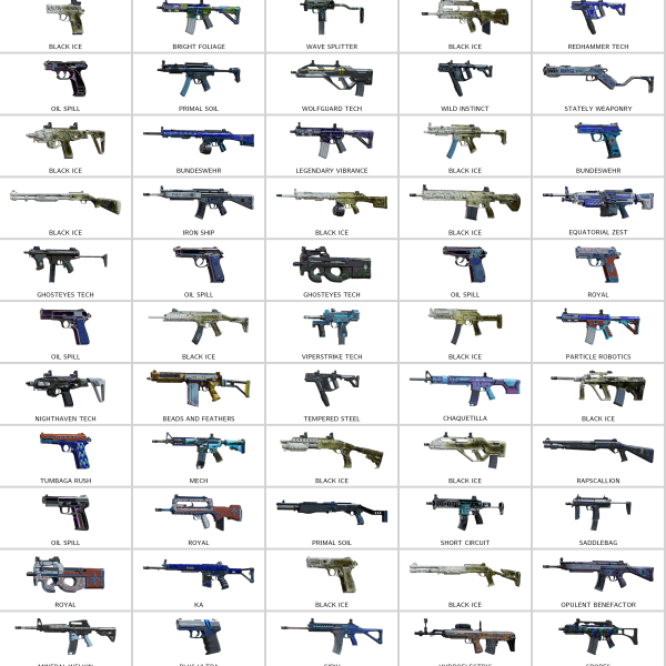 – Future Limelight (Spear), Packing (T-5 SMG), Blood ‘n’ Rust (Bailiff), Musa Banana (SPAS-12), Chemical Board (UMP45)