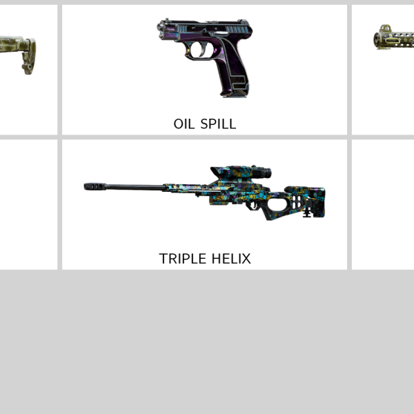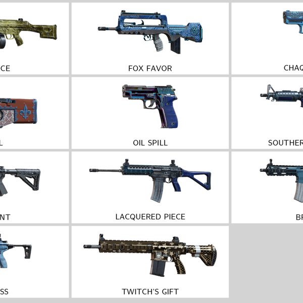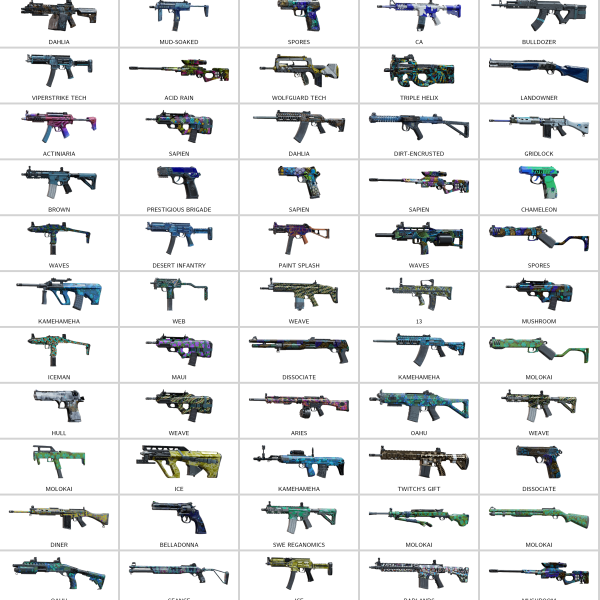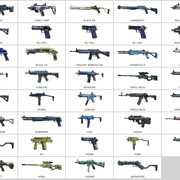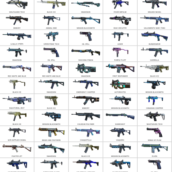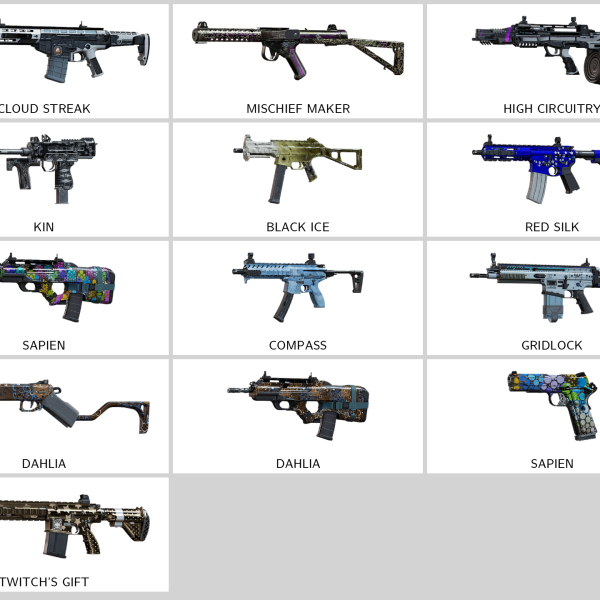 – Berber Ornaments (AK-74M), Subatomic Beam (PDW9), Tundra (P90), Ethereal Marksman (416-C), Tentacle Lace (ACS12), Stone Talon (T-5 SMG)…