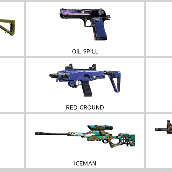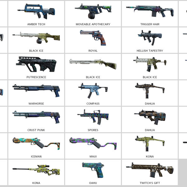 – Berber Ornaments (AK-74M), Subatomic Beam (PDW9), Tundra (P90), Ethereal Marksman (416-C), Tentacle Lace (ACS12), Stone Talon (T-5 SMG)…