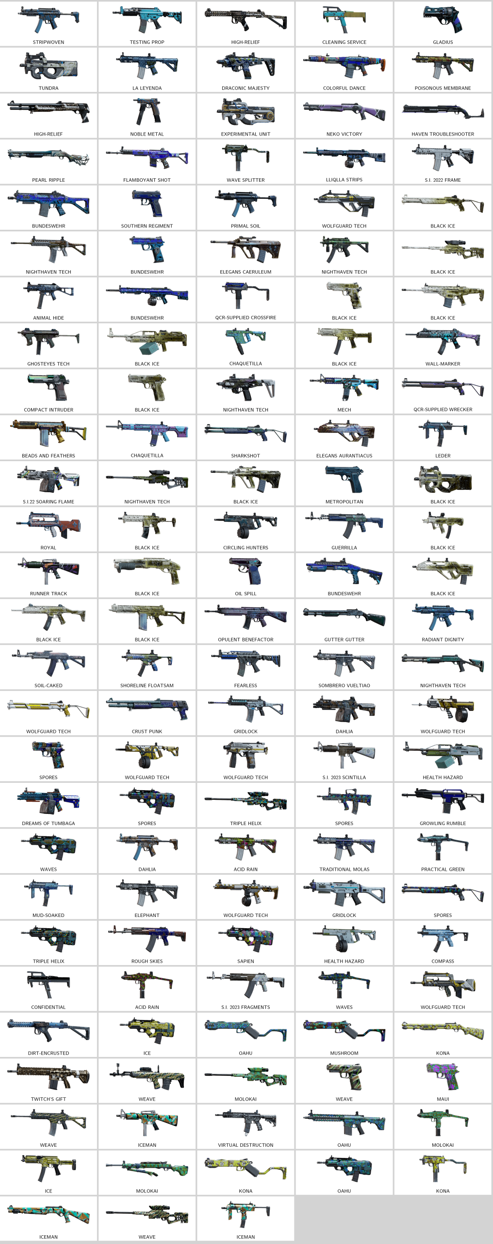 – Subatomic Beam (PDW9), Testing Prop (K1A), Tundra (P90), Ethereal Marksman (416-C), Gladius (Keratos), Colorful Dance (ARX200)…
